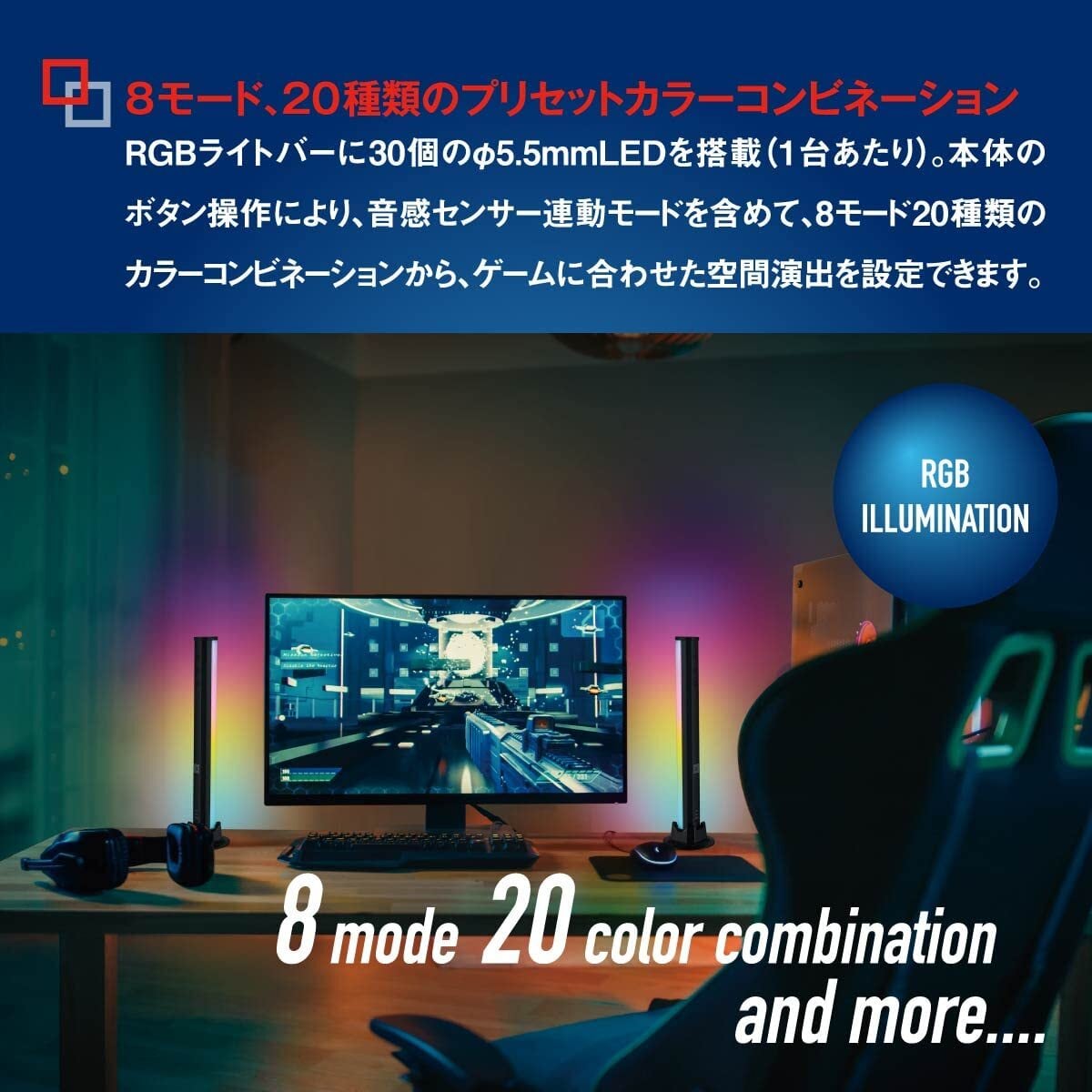 【 特 長 】 ◆ゲームマインドを刺激する空間を演出、RGBイルミネーションライト ◆音感センサーマイク内蔵でゲームサウンドなどに連動して光ります。 ◆8モード、20種類のカラーコンビネーションから、ゲームに合わせた空間演出を設定できます。・ モードボタン:音感マイクがONになり、音楽や周囲の音に応じてイルミネーションが光ります。モードボタンを押すたびに、イルミネーションのバリエーションが変化します(全8種類)。・ カラーボタン:音感センサーOFFの状態でイルミネーションが光ります。カラーボタンを押すたびに、イルミネーションのバリエーションが変化します(全20種類)。