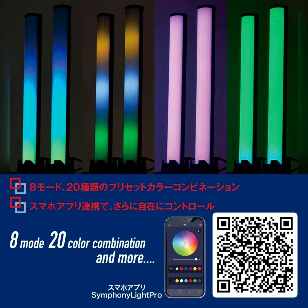 ◆専用アプリ「SymphonyLightPro」をダウンロードすれば、イルミネーションモードが117種類から選べるほか、明るさや色調整、タイマー設定も可能になります。 ◆縦でも横でも使えるフリーレイアウトスタイル。PCの両サイドに立てて使うほか、横置きでも使える便利なスタンドが付属。壁面に向けて間接照明のように使うこともできます。 ◆USB給電式(専用USBコード付属)