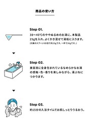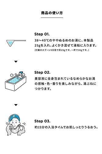 ●手軽に使用できるパウダータイプで、入浴中に水に溶けることで、簡単にお湯に溶け込みます。どんなバスタイムにもぴったりで、特別なリラックスタイムを演出します!