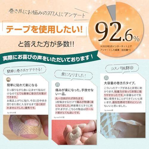 この巻き爪テープは、強粘着と通気性素材を使用しており、巻き爪や陥入爪の悩みを軽減するために設計されています。自宅で手軽に使える、心強いアイテムです!