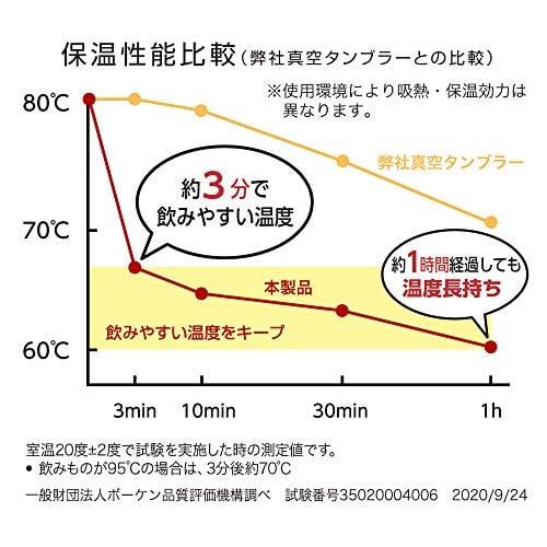 熱々の飲みものを入れて、約3分間で飲みやすい温度に、そのまま約1時間保つことができる