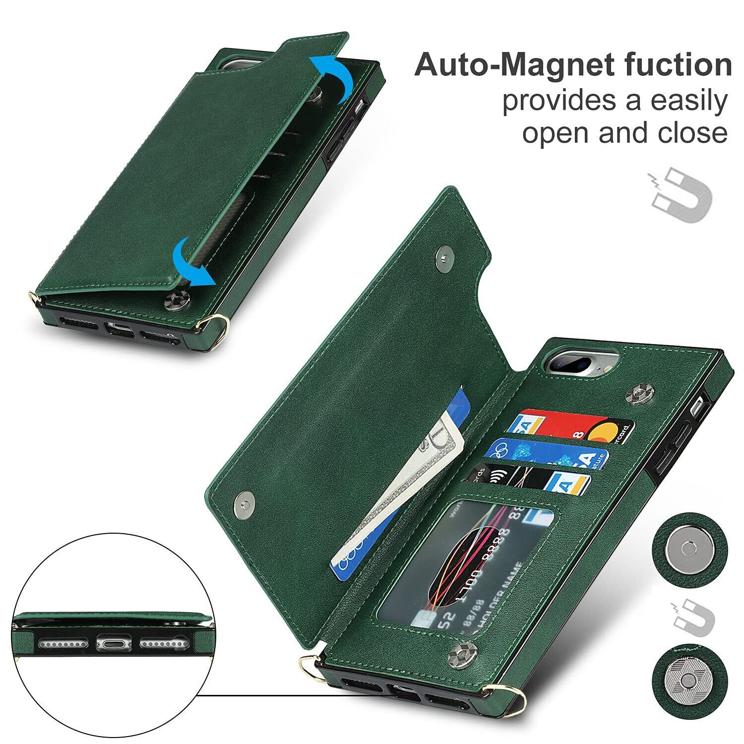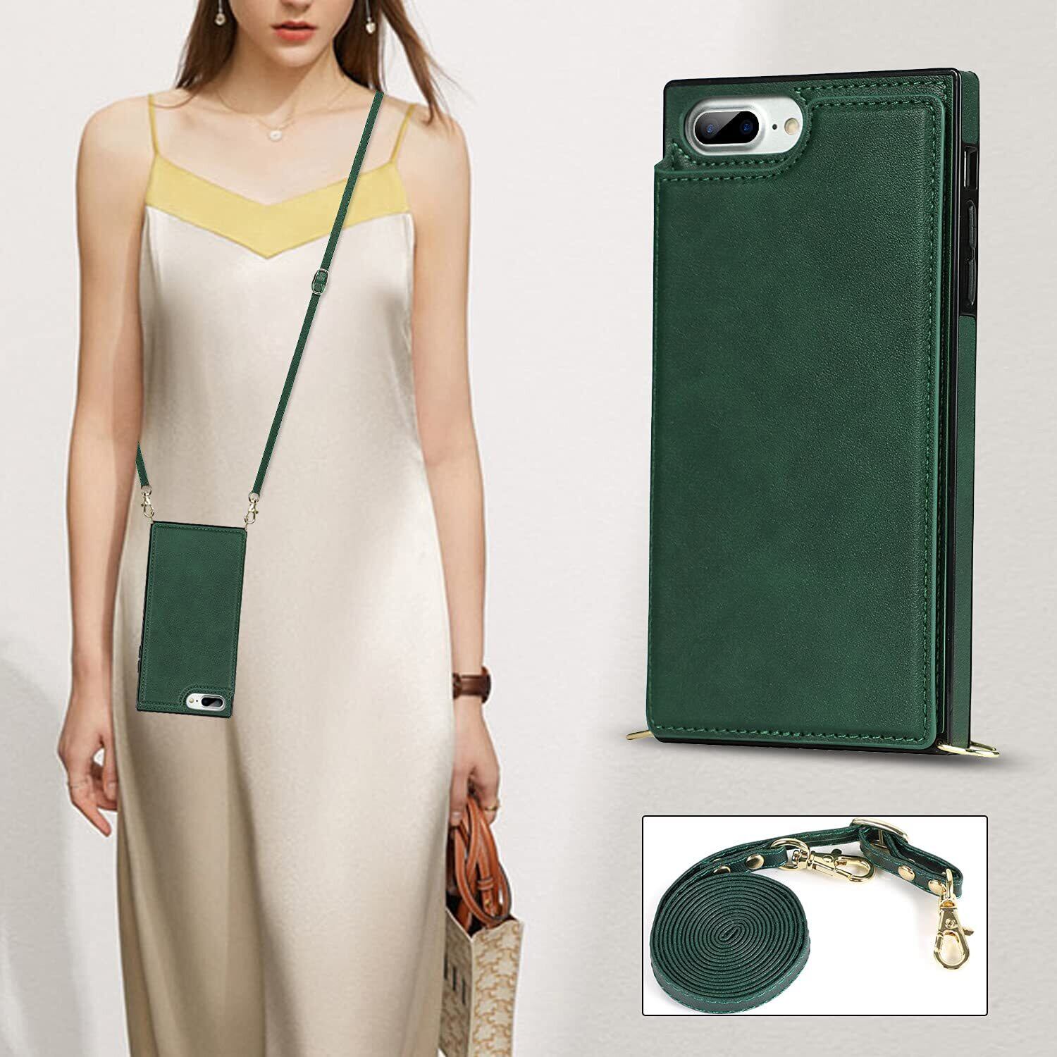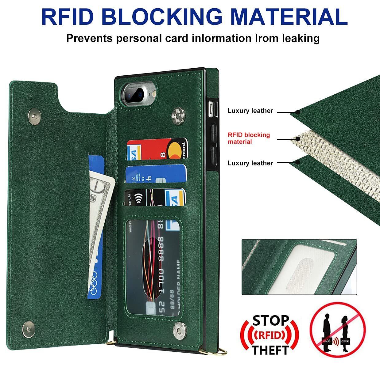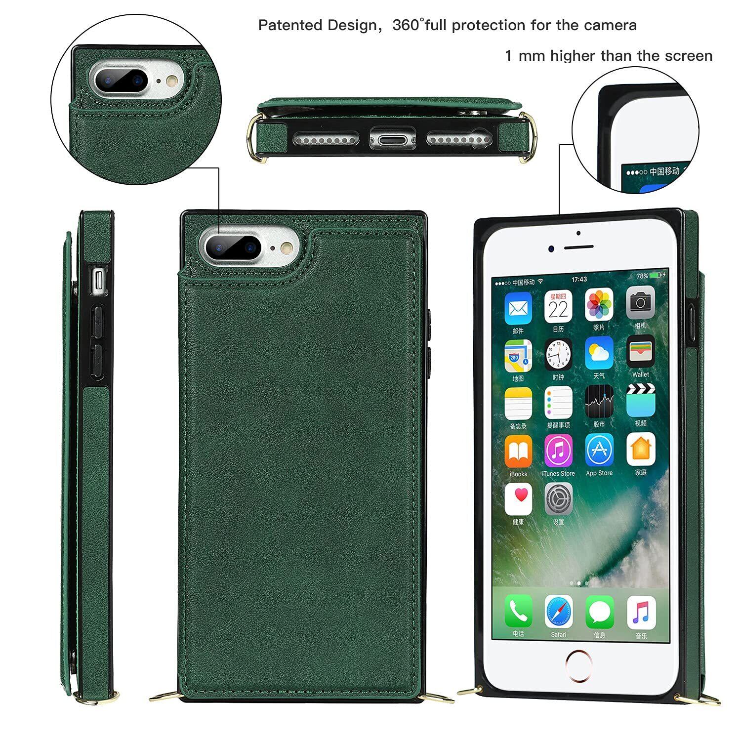 Cavor 手帳型ケースiPhoneSE 2世代(2020)/iPhoneSE 3世代(2022)/iPhone 7/用のケース ショルダー肩掛け 首かけ斜めがけ 落下防止case カード収納スマホ ケース【RFID機能】財布型 PUレザー磁気閉鎖付きの専属ストラップ同梱なのでQi急速充電対応 横置 ICカードホルダースリ防止対策 - ダークグリーン