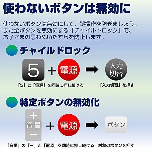 ●押しやすいボタンと見やすい表示 ●デジタル放送の操作ができる ●国内の主要なメーカーに対応 ●ボタン無効機能で使わないボタンの誤操作を防止 ●バックアップ機能搭載で電池交換時に再設定が不要