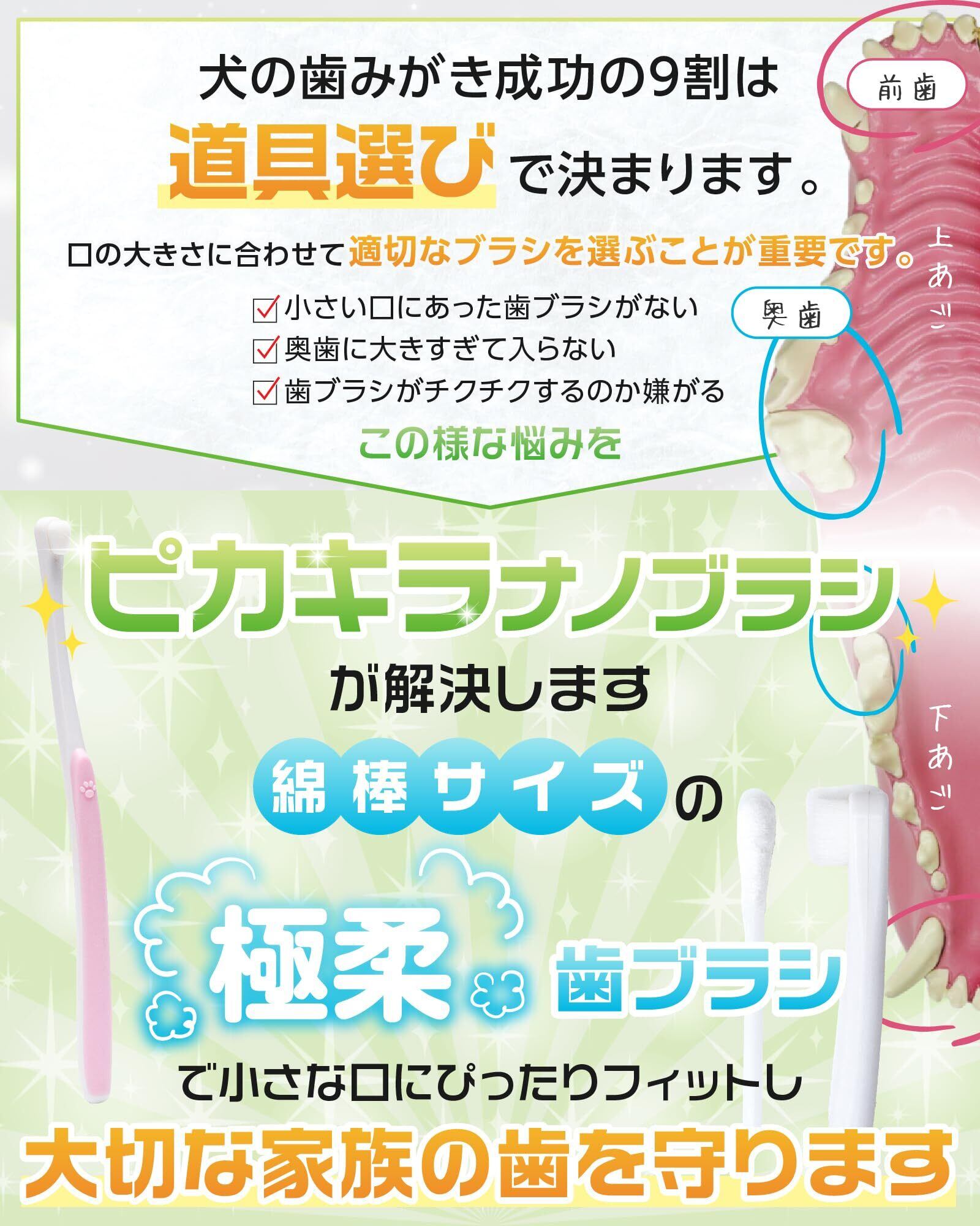 【超小型犬用歯ブラシセット】犬の歯磨きの成功の9割は道具選びから決まります。歯の大きさに応じて適切なブラシを選ぶことが重要です。そこでワンちゃんの為の歯磨きセット「 ピカキラナノ ブラシ超小型犬用」が誕生しました!