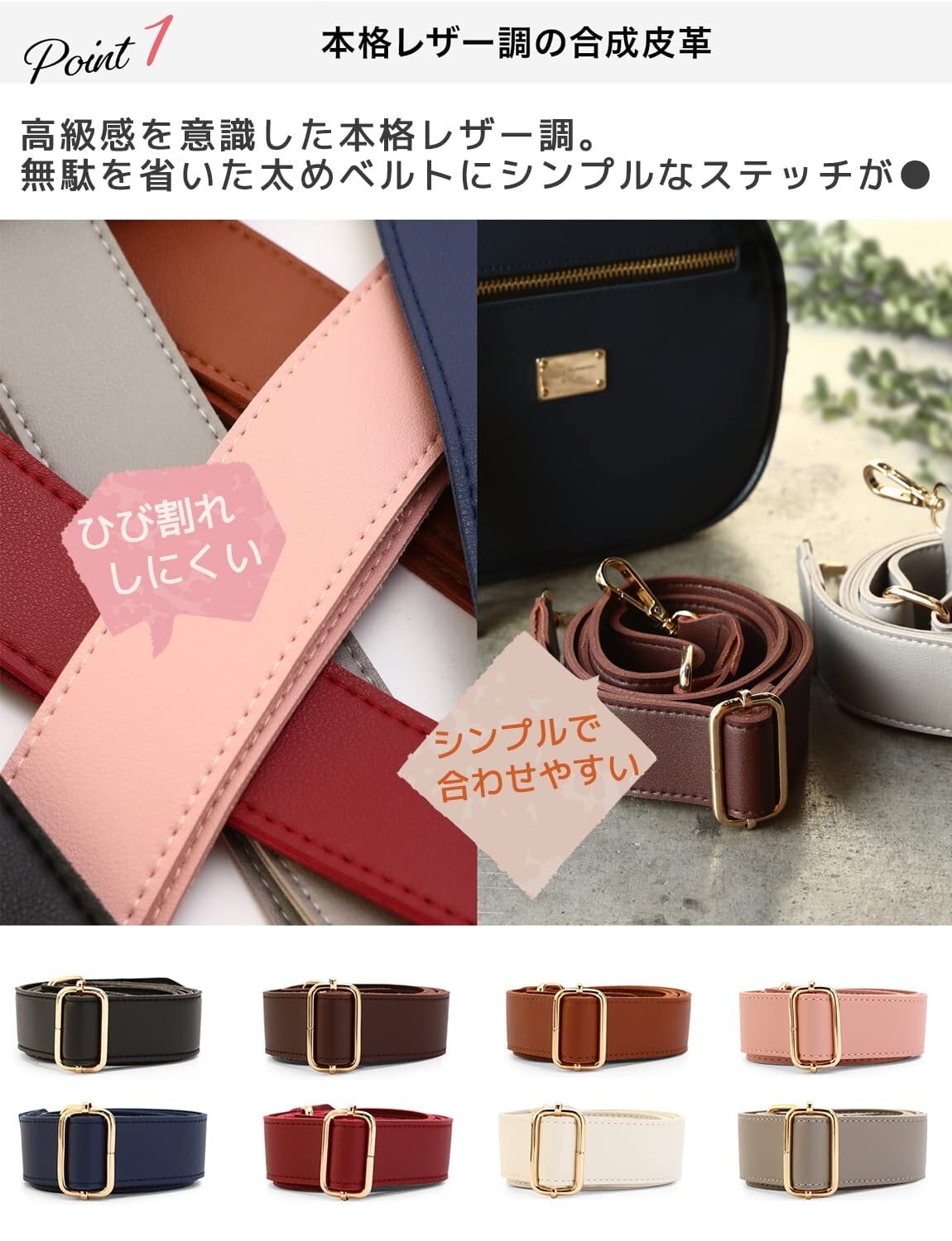 ショルダー紐長さ約80~134cm(フック含む)、ベルト幅約3.9cm、厚み約4mm、重さ約136g、合成皮革素材