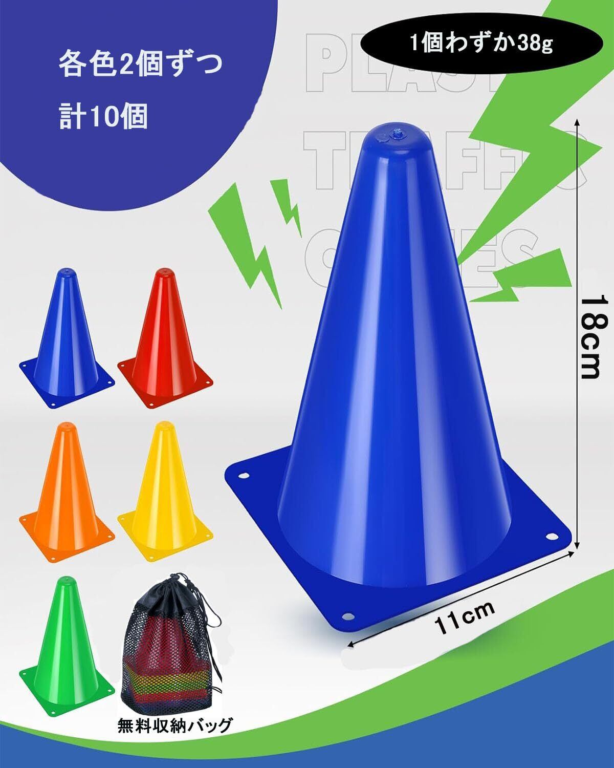 YINKE コーン ミニ カラーコーン 10本セット 全5色(各色2個)三角カラーコーン マーカーコーン カラーバリエーションあり サッカー フットサル 軽量タイプ 収納ポーチ付き(18cm)