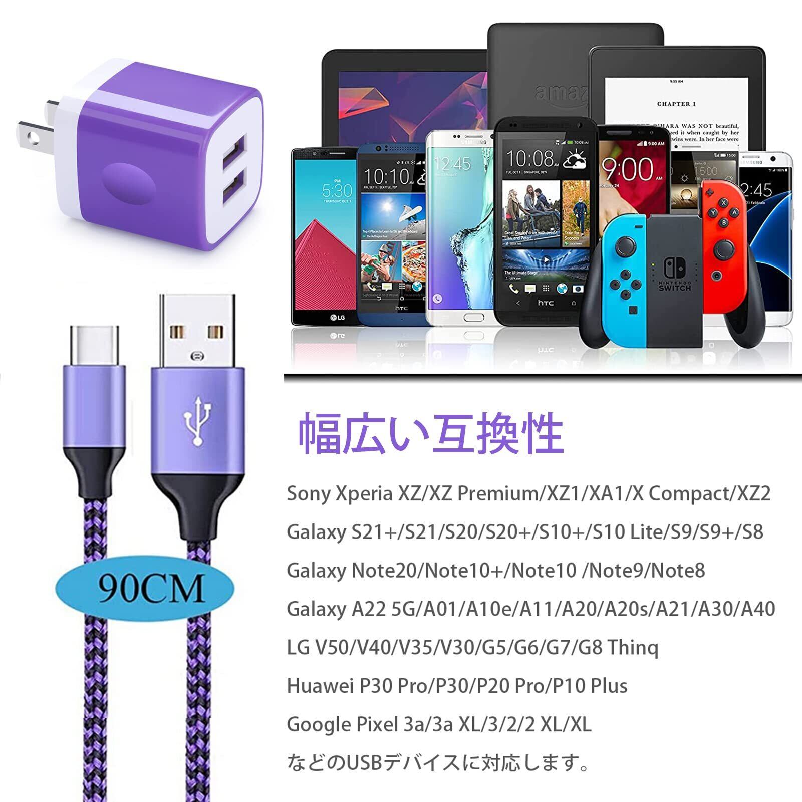 Viviber アンドロイド充電器 PSE認証済み タイプc ケーブル1本付き【0.9M】 USBコンセント 携帯充電器 スマホ充電器 Type-C 充電コード 純正 ACアダプター Andriod ドコモ DOCOMO充電器 Galaxy/Xperia/Oppo/PixelなどのタイプC機種に対応
