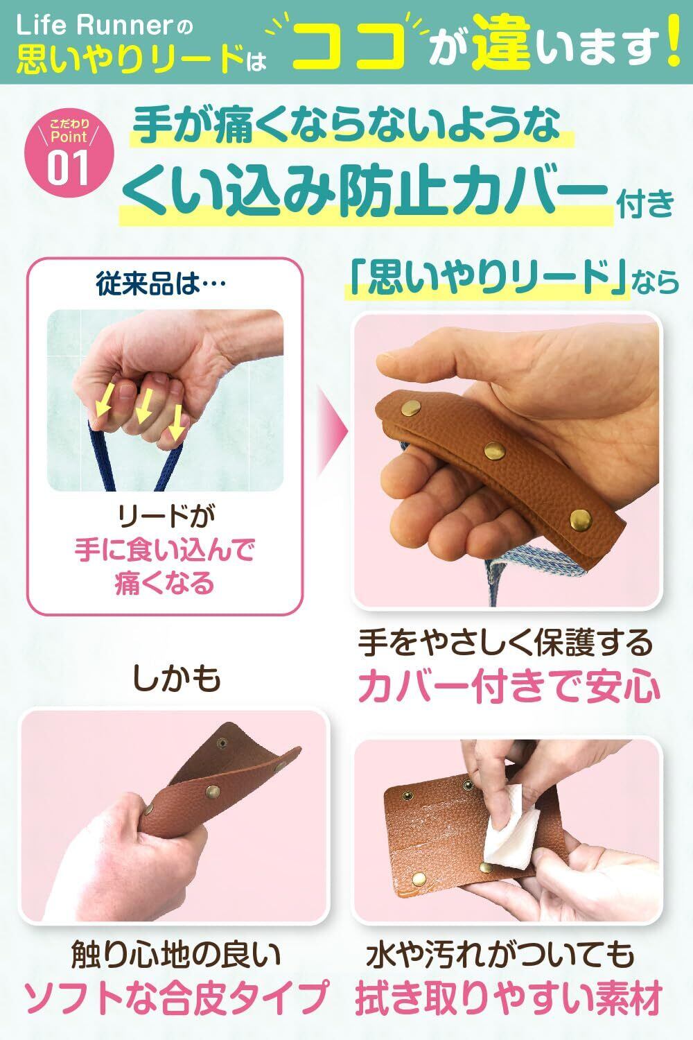 【手への食い込み防止】ワンちゃんが引っ張っても手が痛くならないように、持ち手部分に“食い込み防止カバー”を付けました。ソフトな質感で握り心地が良いので、お散歩が快適になります。