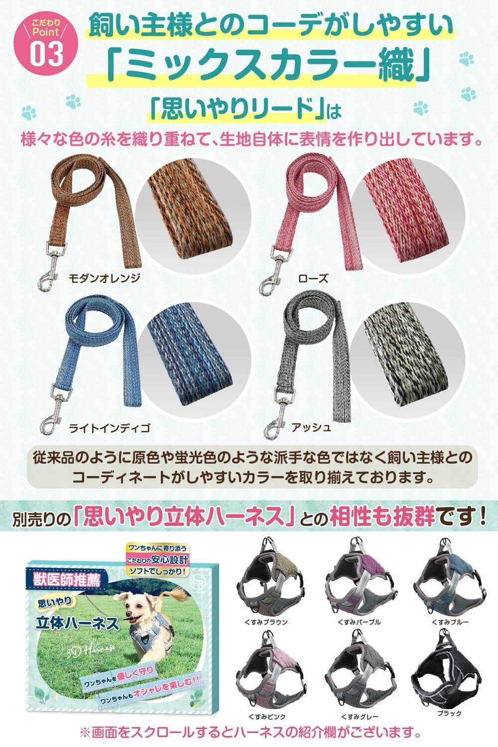 【豊富なバリエーション】リード長さは1.2m・2.0m・3.0mの3種類、犬の体重で10kg以下用・10〜20kg用・20kg以上用の3種類、カラーは“モダンオレンジ”・“ローズ”・“ライトインディゴ”・“アッシュ”の4種類揃えており、バリエーションの組み合わせは全36種類。ワンちゃんの体重や使用目的に合った、“思いやりリード”をお選び下さい!!