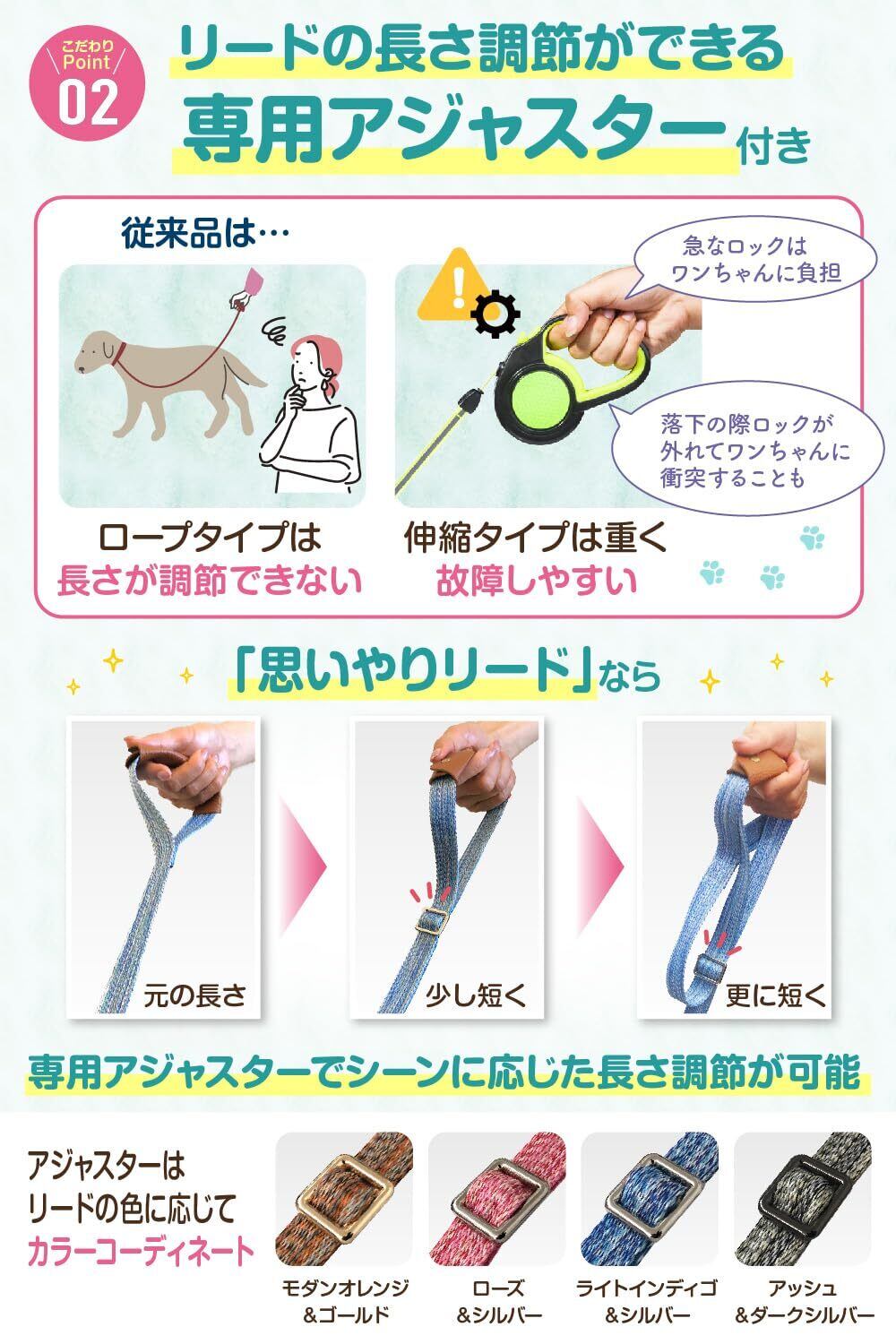 【リード長さの調節機能】ユーザ様のリクエストが最も多かったのがリードの長さ調節機能。伸縮リードは重たくて使いづらいという方も、この“思いやりリード”なら軽量で、手軽にお使いいただけます。訓練用・しつけ用の長さにも調節できます。