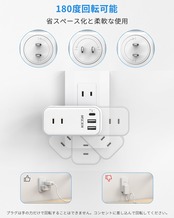 「コンセント 180度回転」3個のAC口は三つの方向に配置されていて、お互いに干渉しないで、大きなアダプター同士が同時に挿入しても大丈夫です。回転電源タップは左右90度回転することができ、水平または垂直ソケットを心配する必要はありません。色々な場所でのコンセントの増設に適用です! (注意: プラグは手の力だけで回転することはできません。45度回転するたびにガチャという音がします。プラグは最大180°回転でき、360°ではありません。プラグの回転が難しい場合は、無理に回転しないでください。プラグの回転方向を変更するか、ソケットを抜いて背面プラグの方向目盛を見てみてください。)