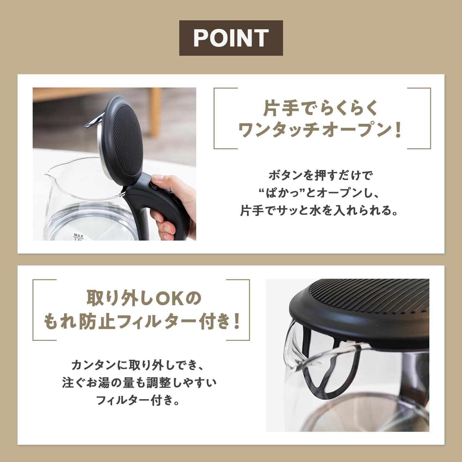 【✨皆様のお悩み解決✨】お湯が一度に出てきてしまうのを防ぐため、お湯の量が調整しやすい”漏れ防止フィルター”を付けました。さらに、従来品は両手で蓋を開けるのが面倒でしたが、Latunaの電気ケトルは指1本でワンタッチオープン!目盛りの表記も大きく改良し、さらに使いやすくなりました。 また、重さは660g(ペットボトルおよそ1本分)なので、持ち運びや注ぐ際も片手でラクラクこなせちゃいますコンパクトで軽量なので一人暮らしの方や老若男女問わず快適にお使いいただけます。