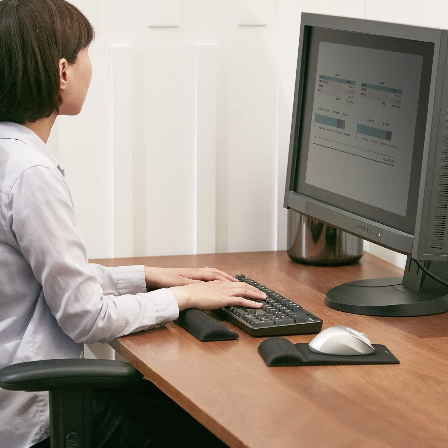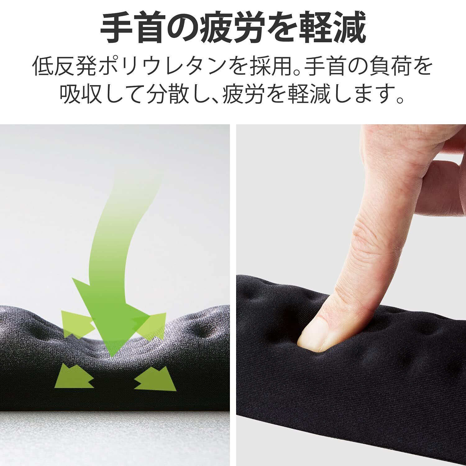 リストレスト部特徴1:反発弾性が非常に小さく、優れた衝撃吸収性能を持っています。圧力に対して復元速度が遅いため、優れた荷重分散性能を有しており、手首の形状にフィットし長時間のパソコン作業をサポートします。