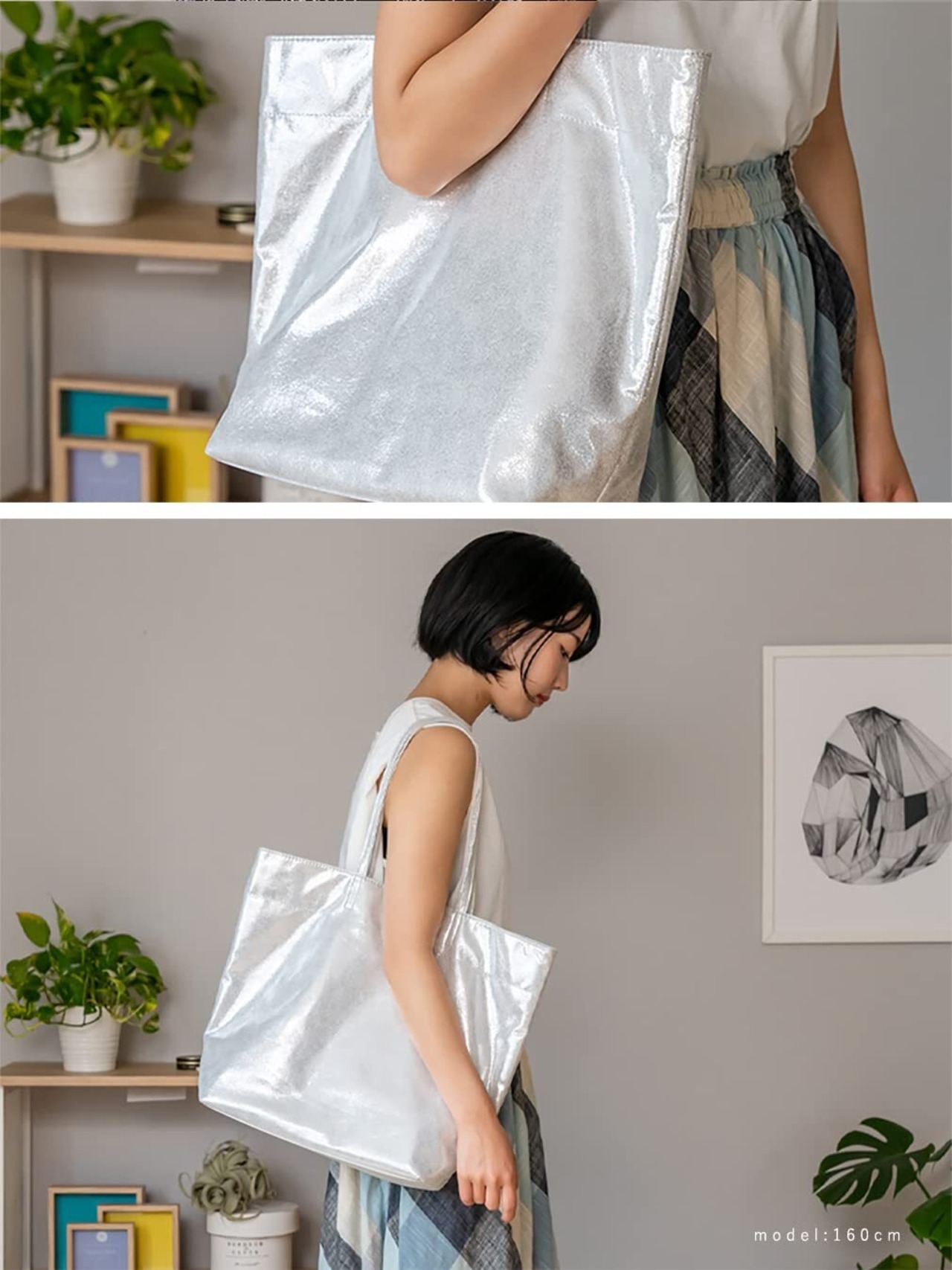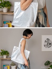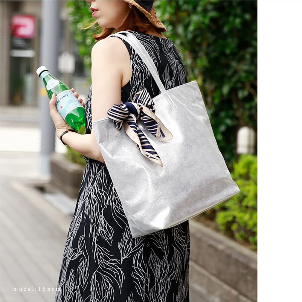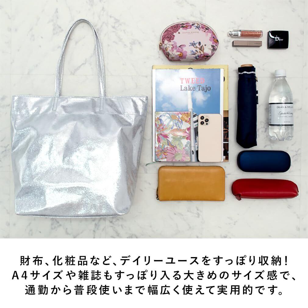 メタリックが目を引く、大容量のラメトートバッグ。 メイン素材には、メタリックな柔らかいフェイクレザーを使用。 総重量250gととっても軽量で、シンプルなデザインが魅力。 A4サイズや雑誌などが入る縦型デザインで 普段使いはもちろん、通勤用バッグとしてもオススメ。 前面メタリックなので、シンプルコーデのアクセントとしても◎