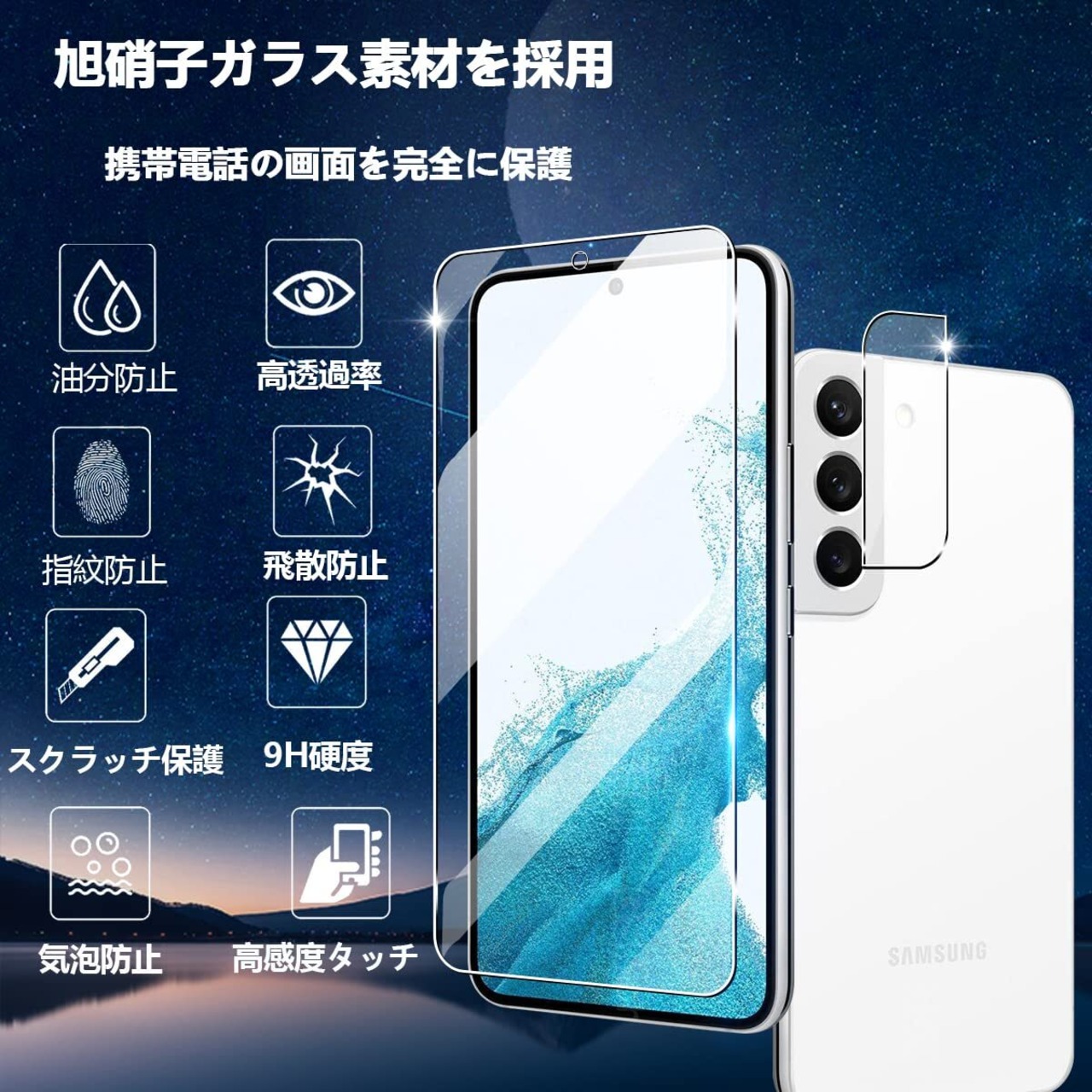 対応 Galaxy S22 ガラスフィルム 2+2枚セット 指紋認証対応 2枚 用 Galaxy S22 SCG13 SC-51C フィルム 2枚 用 SCG13 SC-51C カメラフィルム 日本製 旭硝子 9H硬度 全面保護 用 ギャラクシーS22 強化ガラスフィルム 保護フィルム ケース 耐衝撃 高透過率 撥水撥油 指紋防止 飛散防止 自動吸着 気泡ゼロ