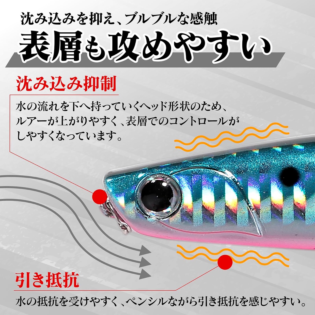 【表層直下】水抵抗を下へ流すリップ形状で潜行を抑え、表層(シャロー)をしっかりウォブンロールアクション。 /ロングキャスト性との相乗効果でなぶらを狙えます。