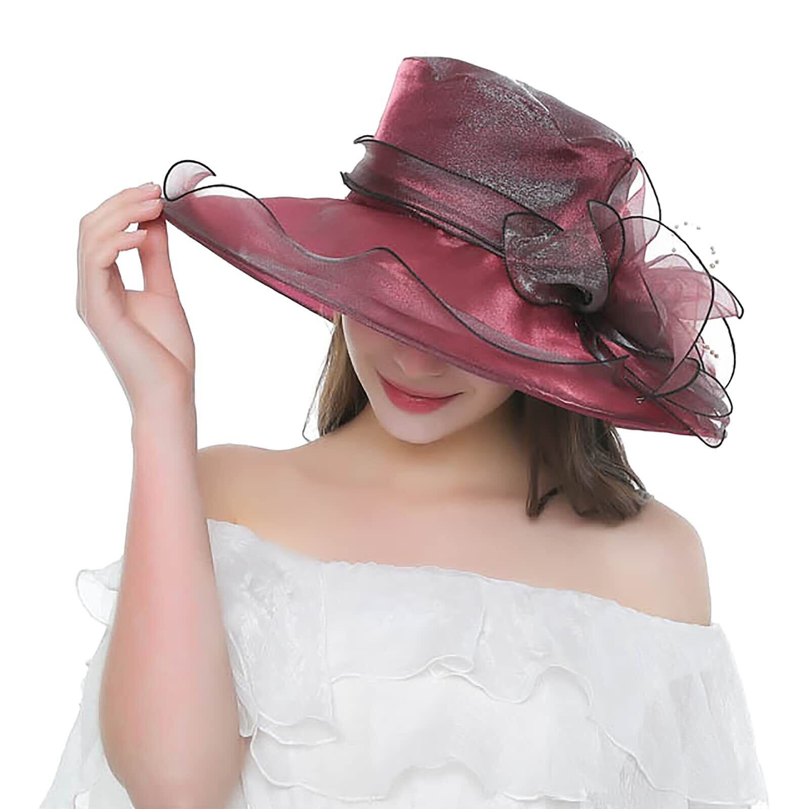 [Folove] オーガンジーハット レディース 夏 遮熱折りたためるクール日よけ帽子 つば広 キャップ 熱中症予防 ビーチハット ジューンブライド ヘッドドレス ダービーハット 教会 結婚式 フラワーハット エレガント パーティー ウェディングドレス ワインレッド