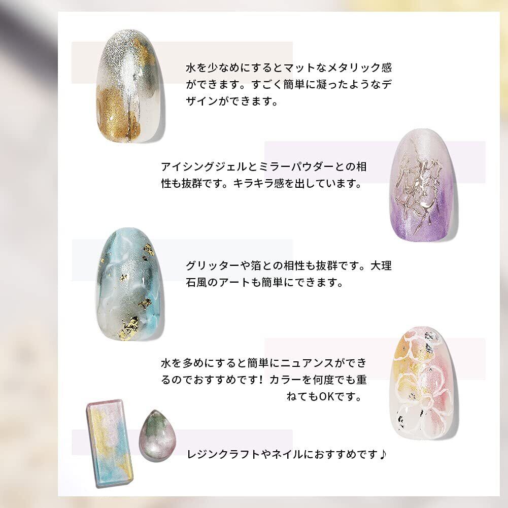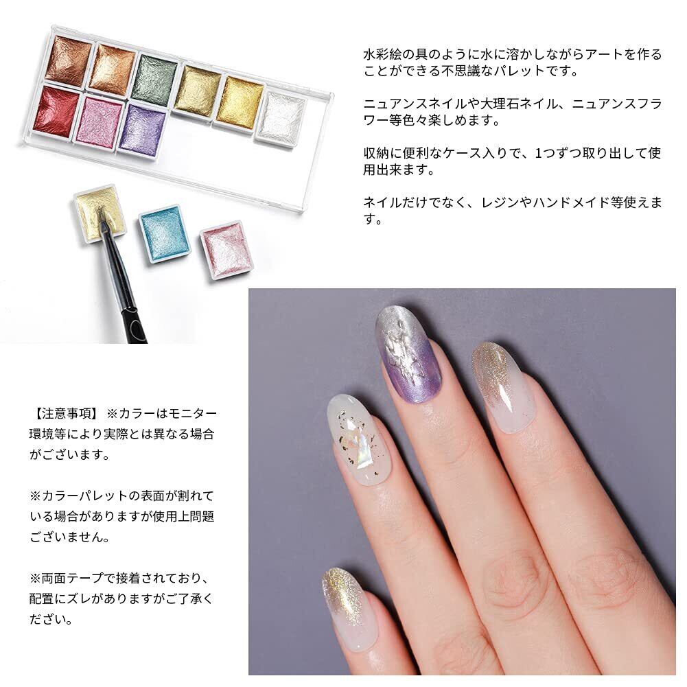 【特徴】水彩絵の具のように水に溶かしながらアートを作ることができる不思議なパレットです。 ニュアンスネイルや大理石ネイル、ニュアンスフラワー等色々楽しめます。 しっかり発色してアートの幅は無限大のアイテムです。メタリックパールな質感で不思議な光沢を楽しんで頂けます。ネイルだけでなく、レジンやハンドメイド等使えます。