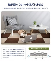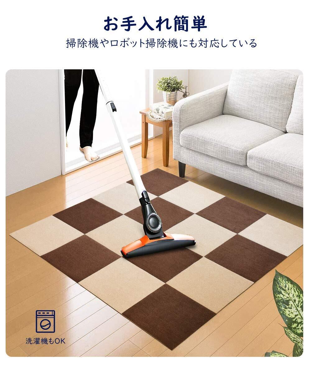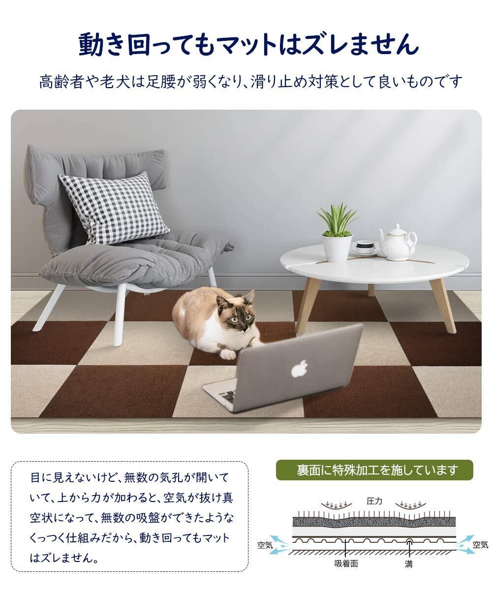 【ずれない 吸着タイルカーペット】空気が抜け真空状態になって無数の吸盤ができたようなくっつく仕組みだから、動き回ってもマットはズレません。厚み約4mmのマットですので、つまずきにくく、扉の開閉の妨げにもなりません。引っ掛かったりする恐れが少なくなる。高齢者や老犬は足腰が弱くなり、滑り止め対策として良いものです。