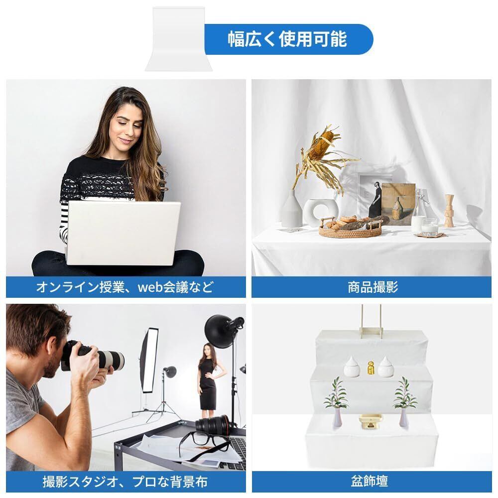 【無反射の撮影背景布】背景布の正面は無反射で、余計な光の反射を防ぎ、光沢感を抑えます。撮影対象を自然に引き立てできます。裏面は反射面、様々な撮影ニーズに満足ができます。白い布は急に決まった web会議 、部屋の汚れがお掃除せずに迅速に使用可能です。そして椅子やテーブルに巻きつけたり、ゴツゴツした壁の表面やロケーションに合わせセッティングが可能で、INS風の写真撮影にも対応可能です。