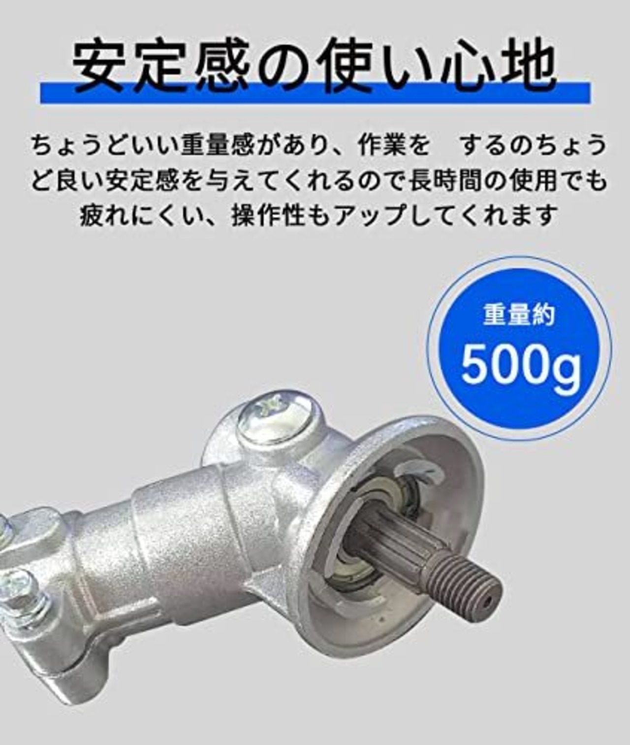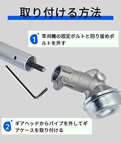 【取り付ける方法】刈払機のギヤヘッドの固定用ボルトと回り止めボルトを外し、ギヤヘッドから竿を抜いて、交換品を装着。メンテナンス方法:使用した後、ギヤケースにある草汁や水をちゃんと清潔、乾燥してください。