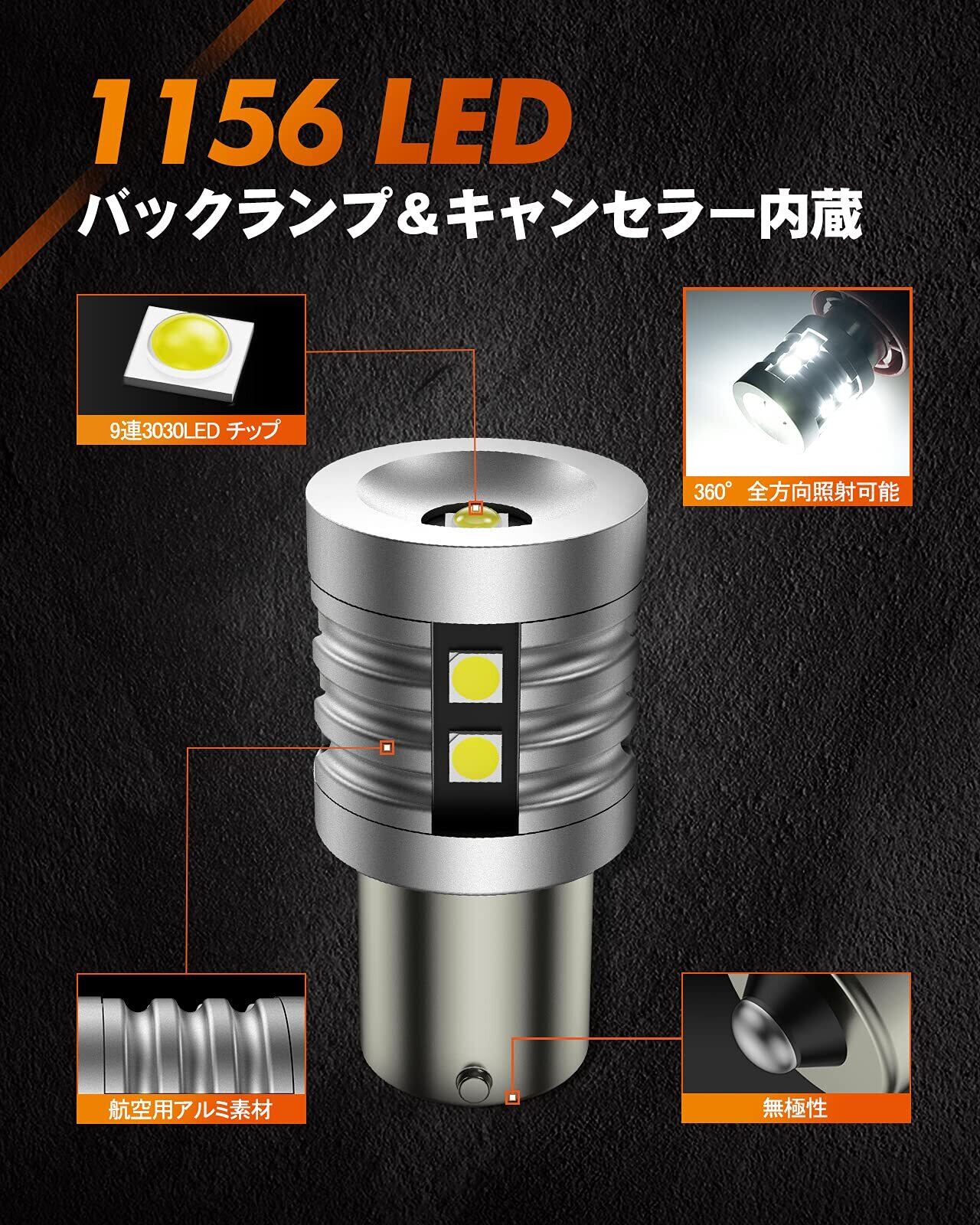 【S25 1156爆光ハイパワーLEDバルブ】 超高輝度のSMD3030LEDを9個搭載、360°全方向照射可能。3000LM超高輝度、ヘッドライトほど明るさで車両後方をより遠くて広くまで照射可能、安全性が大幅に向上します。 ※注意:本製品は12V専用です。 弊社の製品が純正品の仕様に設計されますが、バックランプの消費電力は2個で26wで、抵抗内蔵で、85%のモデルに対応できるが。 オリジナルバブルの消費電力は13W以上の場合は、一部の車種では車の電気配線上では球切れと誤検知してしまうた、警告灯が点灯現象が解消されない可能性が有ります。この場合は、抵抗器を購入する必要があります。 警告灯現象が起きる、ご遠慮なく「店名」-「質問する」の手順でクリックしてお問いあわせください。