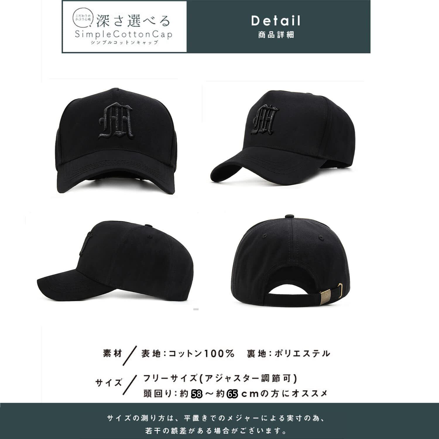 【大きいサイズ】頭周り約:60-65cm、つばの長さ約:8cm、深さ約:15cm。 帽子は金属製のバックルで閉じられており、お好みのサイズに調整できます。横幅が広く奥行が深い傾向にある日本人の頭囲を考慮したデザインのキャップメンズです。