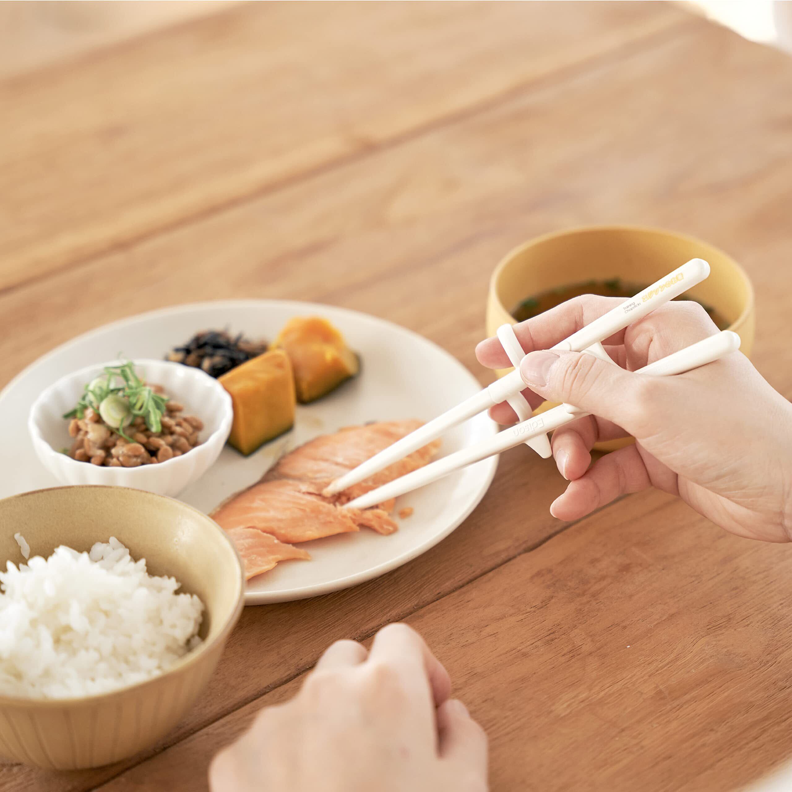 リングに指を入れるだけで、すぐに正しくお箸を使えます。連結部でお箸の交差を防止し、箸先は掴みやすいよう、幅広い形状ですべり止め加工されています。親指と人指し指を直角に広げた長さの1.5倍がちょうどいい箸の長さです。