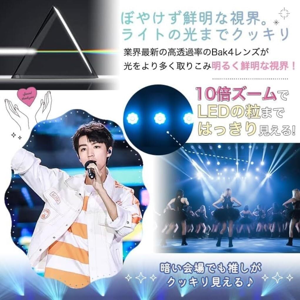 【 コンサート に最適な倍率10倍】「高倍率ほどよく見える!」は間違いです。倍率が高くなるほど、視界は狭くなり手ブレが起こりやすくなります。10倍は様々な会場に対応している最適な倍率です。ステージまでの距離が100mだった場合、 10倍の 双眼鏡 を使用することにより約10mの距離まで近づいた時とほぼ同じ大きさで見ることができます。