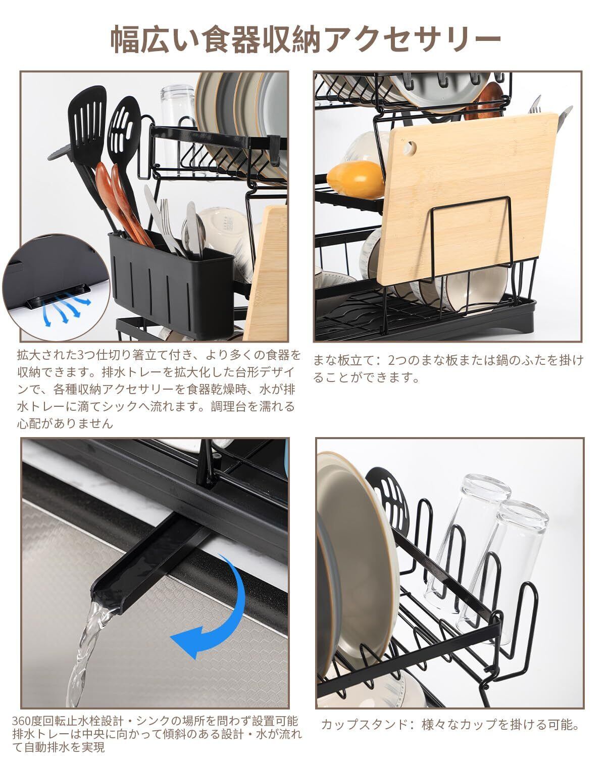 【水切りかごに食器を収納・各種収納アクセサリー付き・拡大された箸立てデザイン】 今回の3段式な水切りカゴは箸立て、まな板立て、カップスタンド、ボウルスタンド、ディッシュスタンドが付きで、お客様の用途によって自由に組み合わせて使用いただけます。箸立ては拡大された設計でより多くの食器を収納できます。別に、水切りラックは下部の排水トレーを拡大化した台形デザインにより、各種収納アクセサリーを食器乾燥時、水が排水トレーに滴てシックへ流れます。調理台を濡れる心配がありません。