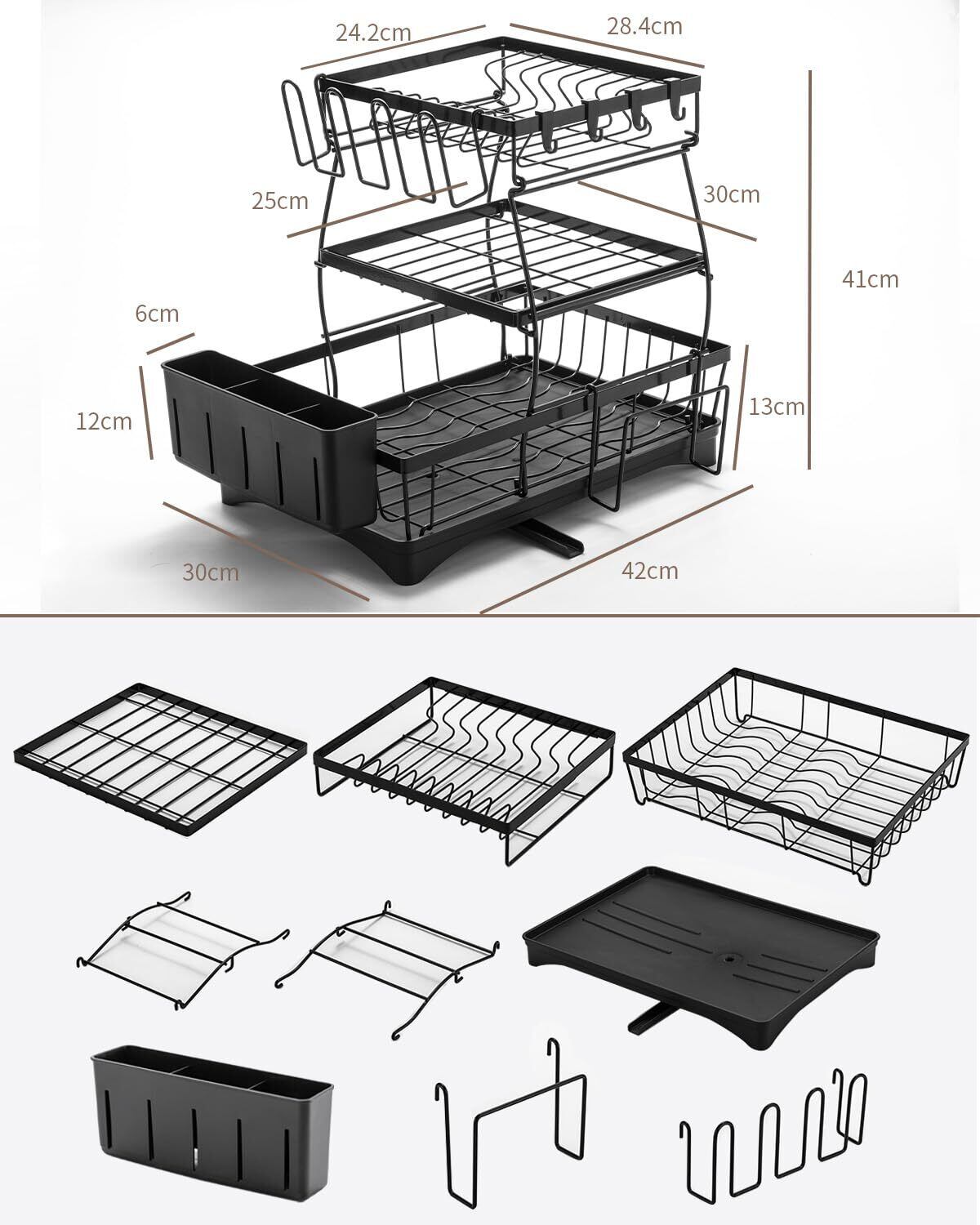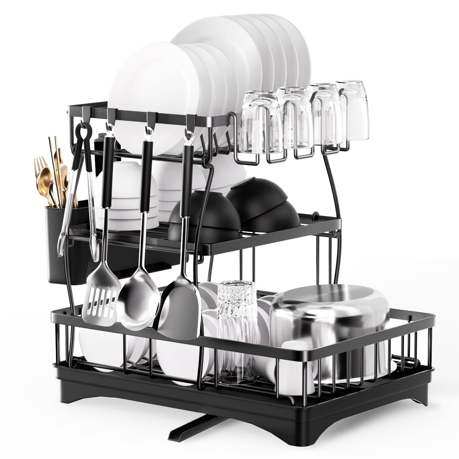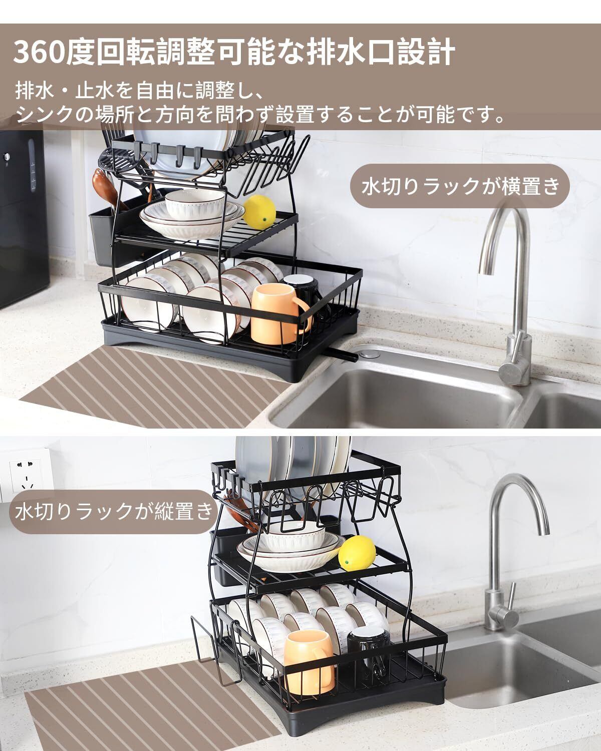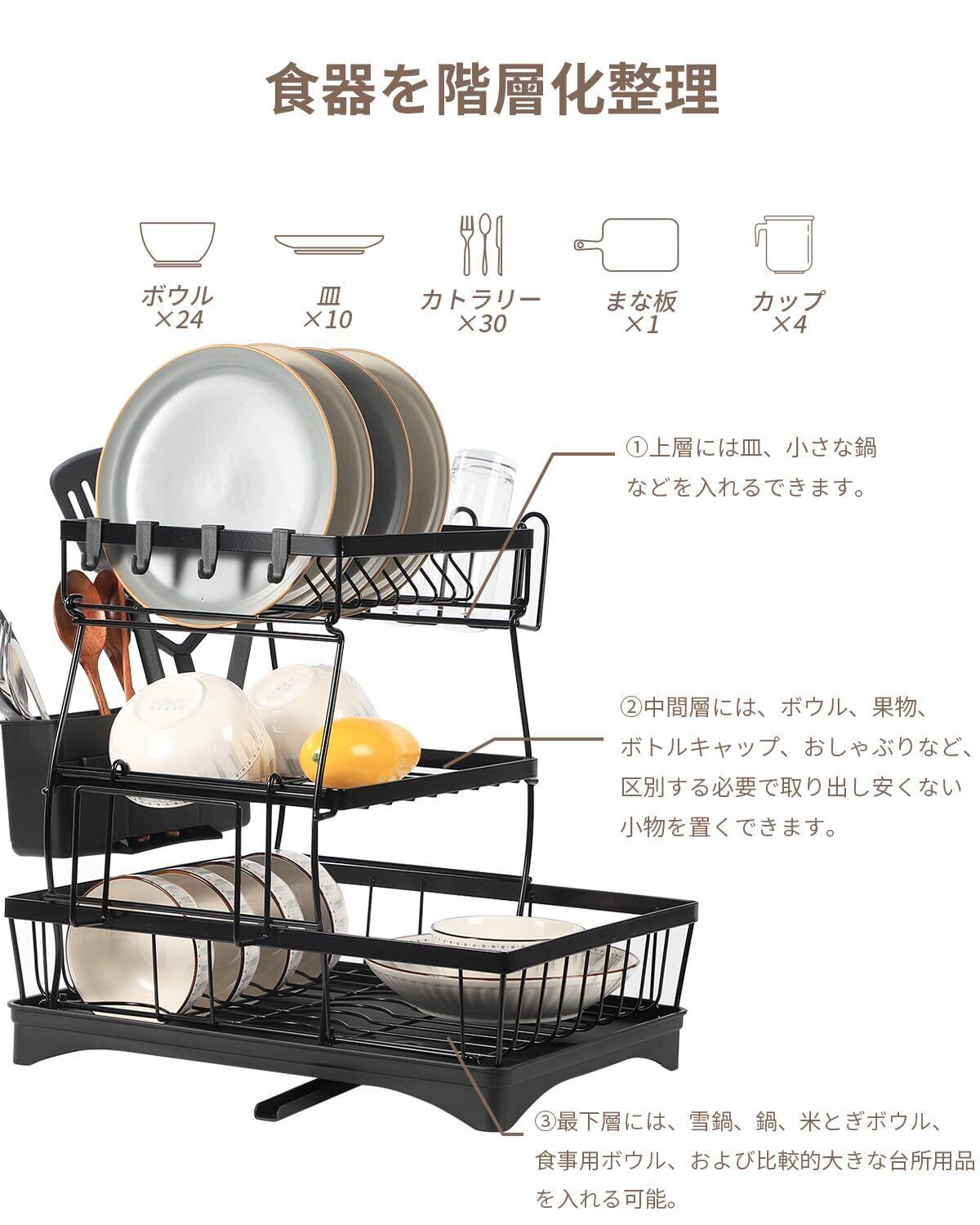 水切り ラック 食器 水切り カゴ 3段 大容量 収納 ラック【360度回転なトレー・箸立て・カップホルダー ・まな板立て・4枚の物掛けフック付き】水が流れる 食器置き場 防錆炭素鋼製 食器乾燥 キッチンラック 食器棚 水切りかご