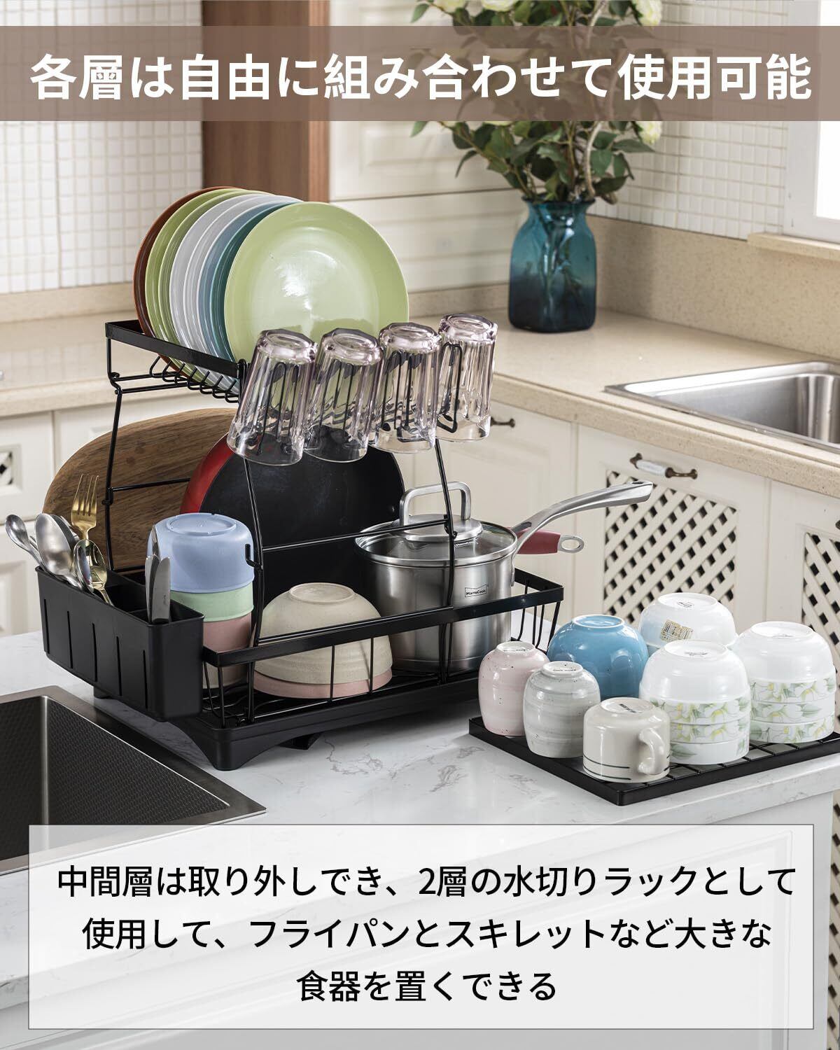 【大容量な3段式水切りカゴ・中間層は取り外す可能で大きな食器を置くにも便利】今回のな水切りカゴは3段式な食器を収納できの設計で(各層は自由に組み合わせて使用可能)、キッチンのような狭い空間を有効的に活用いただけます。それに、中間層は取り外し可能な設計を採用しており、下層に大きな食器を置く必要の場合は、中間層を取り出して2層の水切りラックとして使用することができ、使い利便性と自由度が向上します。上段には最大10枚のお皿を収納でき、中段には最大12個のボウルを収納でき、下段にはボウル、調味料入れ、鍋、シンクまわり小物などを収納できます。カップホルダーは4個カップを収納でき、箸立てホルダーが30本を収納できます。物掛けフックを4枚で、食器を掛けにも便利です。3-5人家族の食器をスッキリと収納できます。キッチンが狭く感じを解消し、キッチンの限られたスペースを広々使える食器収納ラックです。