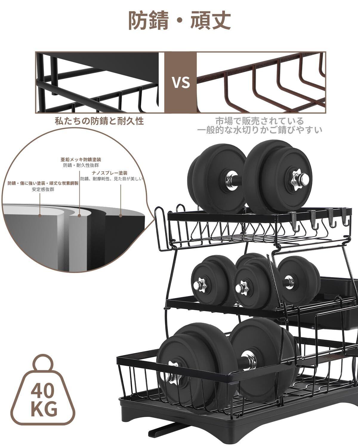 【防錆・傷に強い塗装・頑丈なステンレス鋼製・安定性抜群】水切りかごの本体表面に粉体焼き付け塗装のコーティングを施すことで、見た目も美しく、高級感があるだけでなく、傷や擦れにも強く、防錆性もとても高く耐久性抜群です。独自の固定構造によりネジが不要となり、安定性が大幅に向上しました。普通のステンレス鋼製水切りラックより、耐荷重25%アップされました。耐荷重およそ40kgでしっかりした骨組み設計で、安定感が良いです。それに、汚れや傷が目立ちにくいブラックを採用して、長期間使用しても見た目が美しいです。