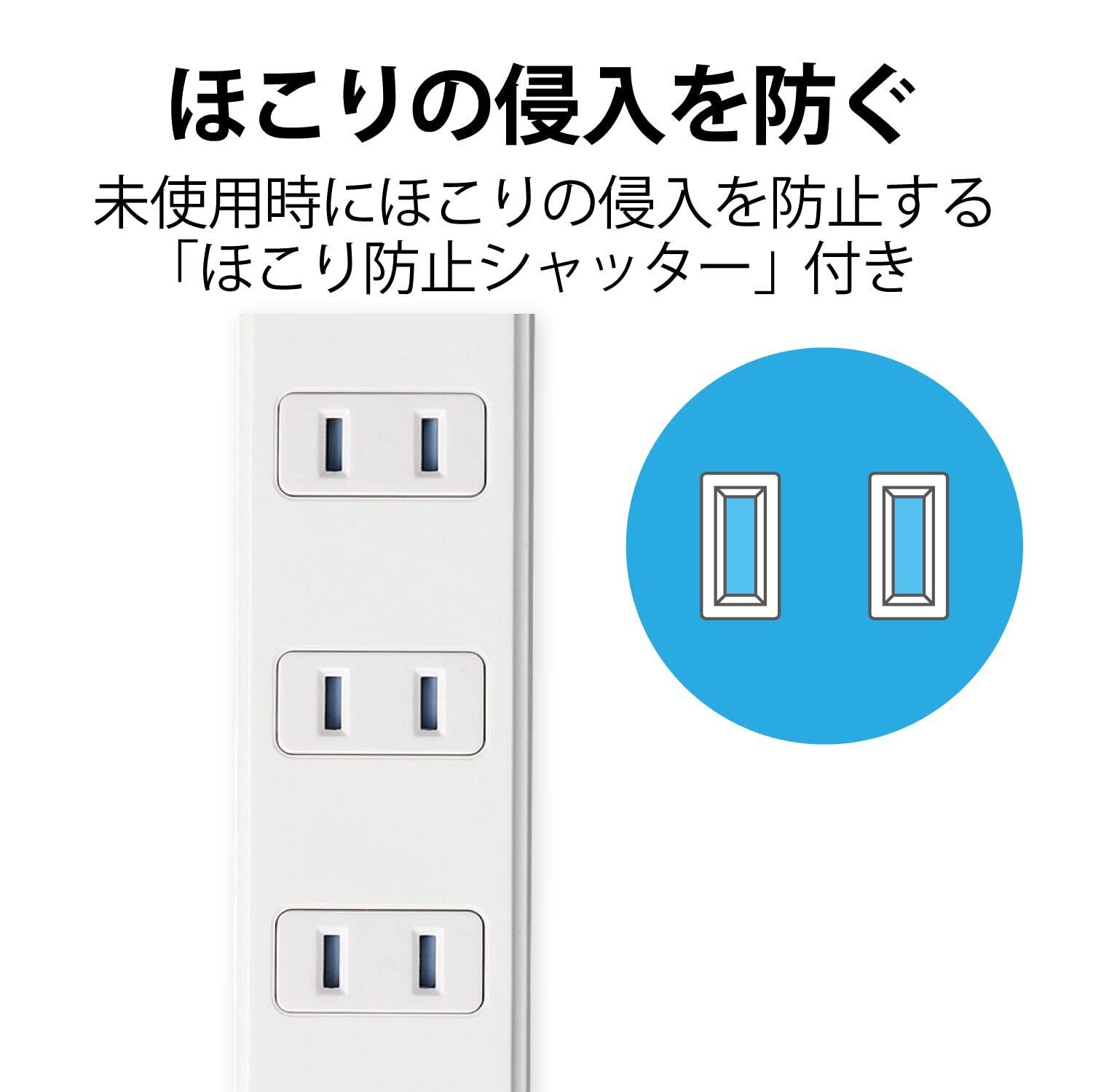 未使用時にほこりの侵入を防止する「ほこり防止シャッター」付き。オフィスやご家庭など、さまざまなシーンで使いやすいほこり防止シャッター付電源タップ。