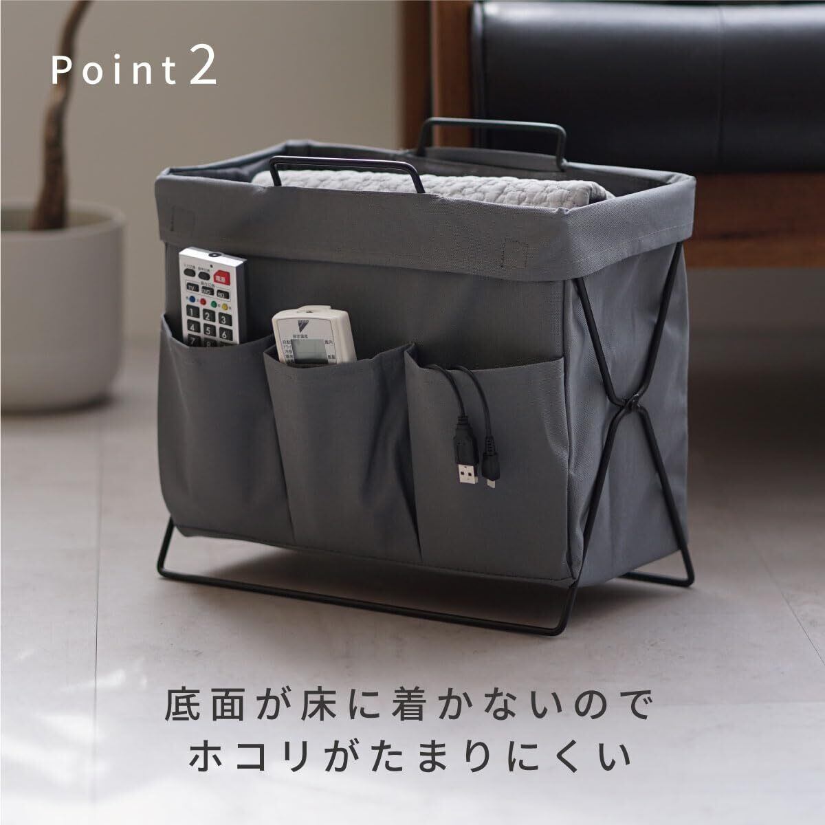 側面にはリモコンが入る3つの前ポケット。リモコンや小物、ケーブル入れに。