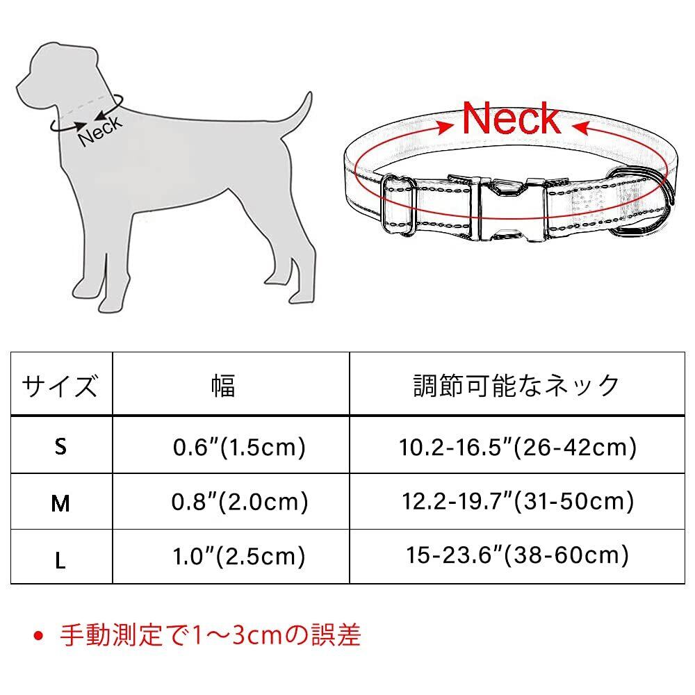【スペック】S:幅1.5cm 調節範囲26-42CM; M:幅2.0cm 調節範囲31-50CM; L:幅2.5cm 調節範囲38-60CM。 あなたの犬に最適なサイズの首輪を決定するために測定します。