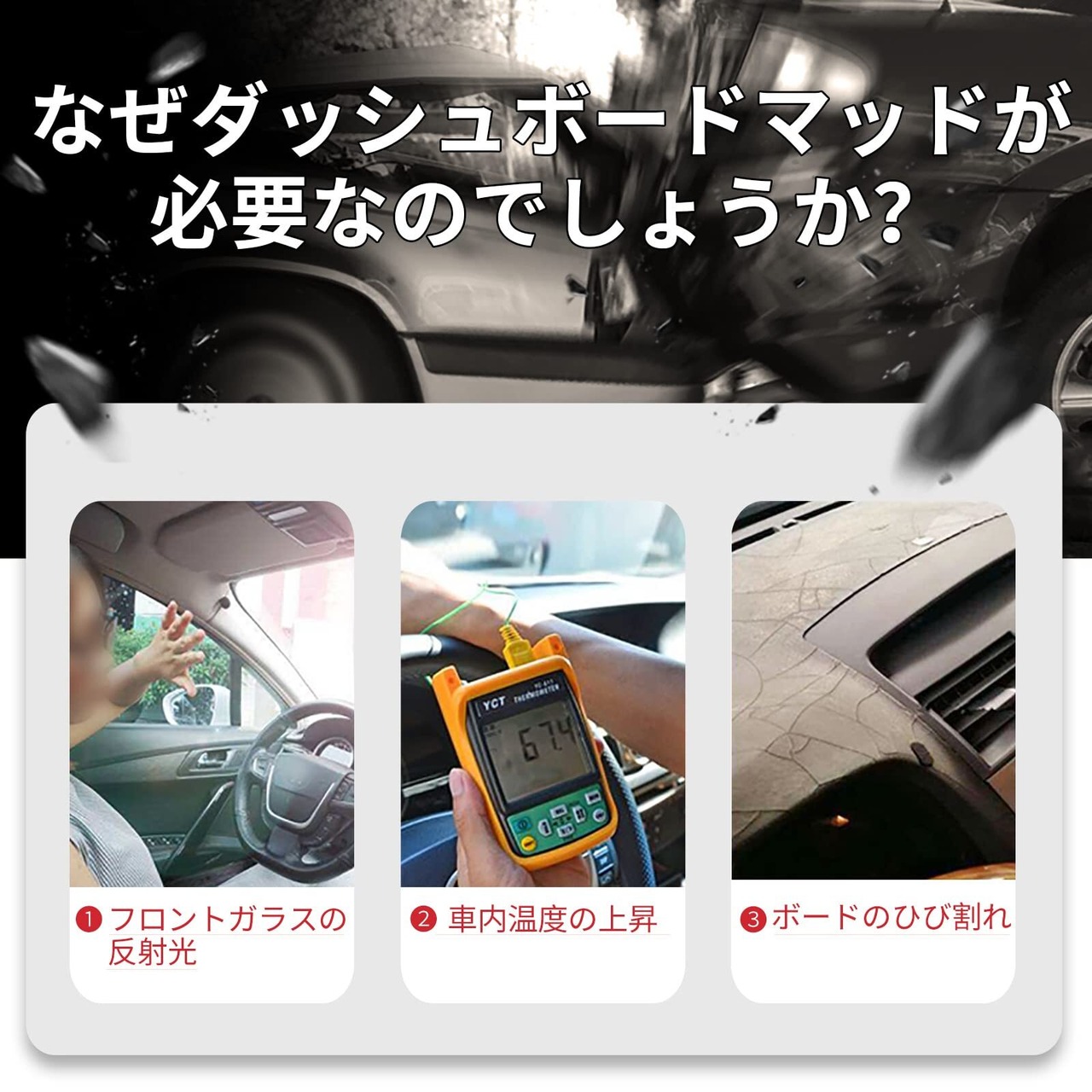 4.【簡単な取り付け】:商品をダッシュボードの位置によって調整してください!ダッシュボードに覆って付属のマジックテープで固定すれば完成です。とても簡単です。梱包による折り目の問題があれば、低温アイロンで簡単に解決できます。