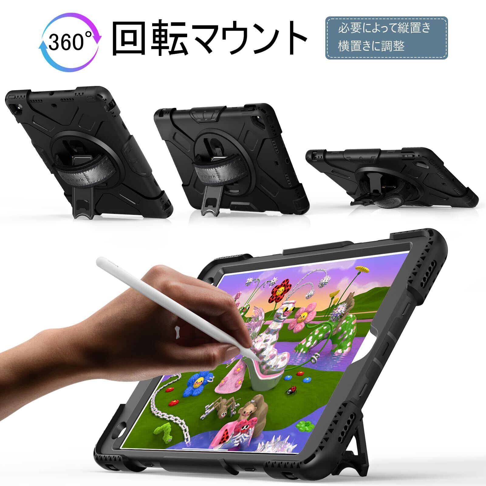 Miesherk ipad 9世代 ケース ipad 10.2インチ 第9/8/7世代(2021/2020/2019) 全身保護ケース 耐衝撃 頑丈 防塵 360°回転ipad スタンド ペン収納 ショルダー/ハンドストラップ 全面保護カバー (ブラック)