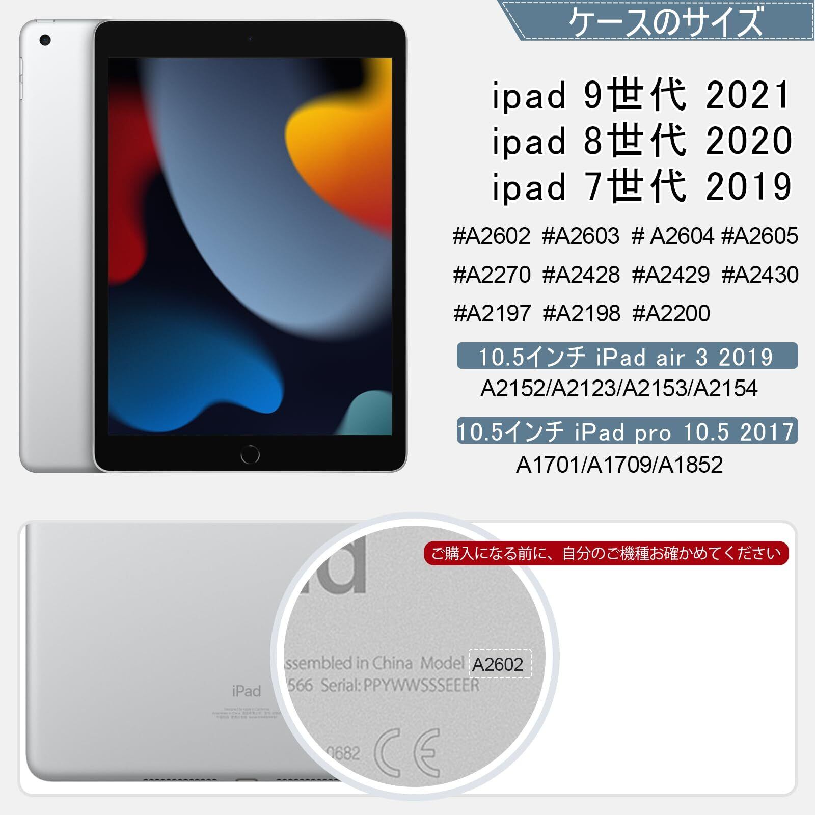 「対応機種」:商品はipad 10.2インチ ケースです。iPad 第9世代、iPad 第8世代、iPad 第7世代 (2021, 2020, 2019)に対応。適用型番:A2602/A2603/A2604/A2605(2021)、A2270/A2428/A2429/A2430(2020)、A2197/ A2198/ A2200(2019)。他の機種に使えません。このipad ケースをご購入になる前に、ぜひ自分のご機種お確かめてください。