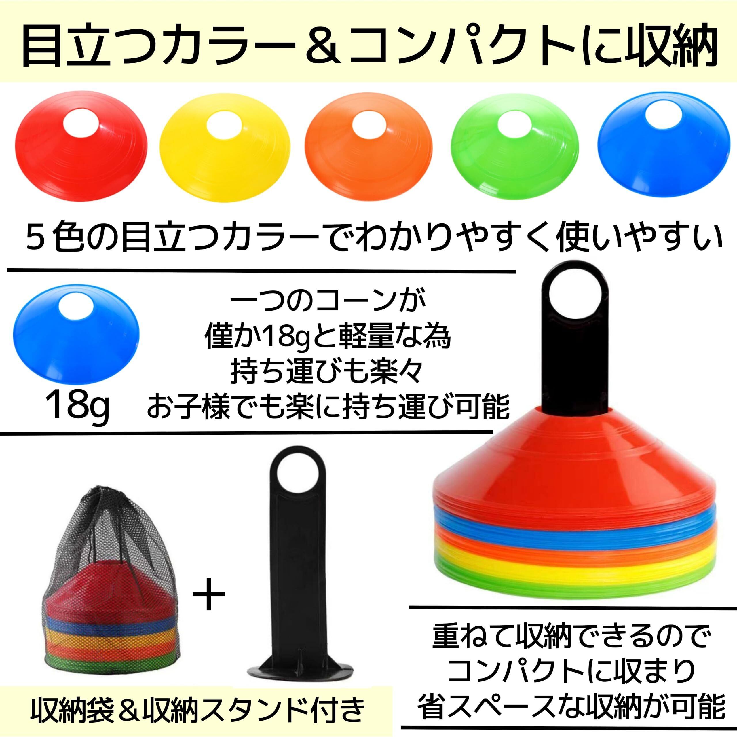 【目立つカラー&コンパクトに収納】5色の目立つカラーでわかりやすく使いやすいマーカーコーンです。一つのコーンが僅か18gと軽量な為持ち運びも楽々、お子様でも楽に持ち運び可能。 収納袋&収納スタンド付きで重ねて収納できるのでコンパクトに収まり省スペースに収納がおさまります。
