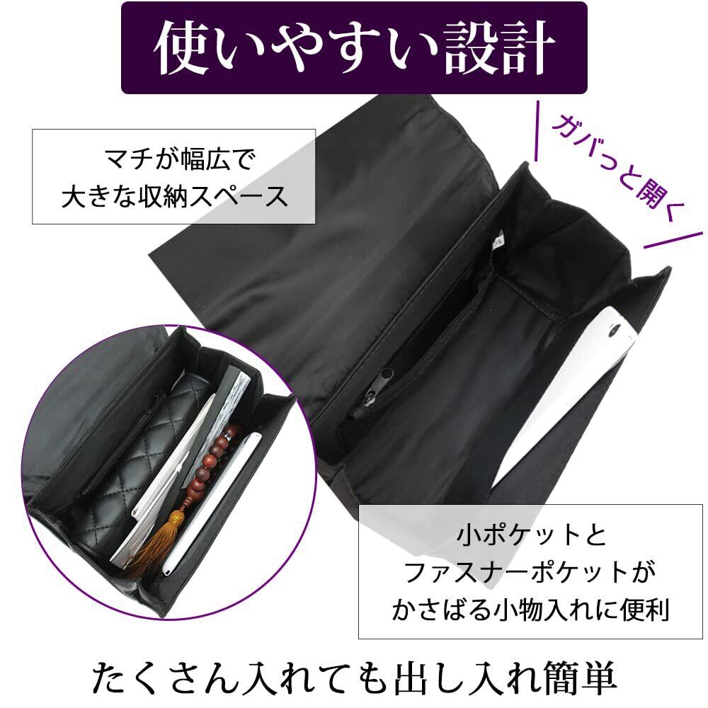 ハンドバッグは見た目はコンパクトですがマチが大きく開くので、財布、携帯、ハンカチ、数珠など必要な物は全て入ります。バッグ内にはファスナー付きのポケットとフリーポケットが付いているので小物の収納に便利です。
