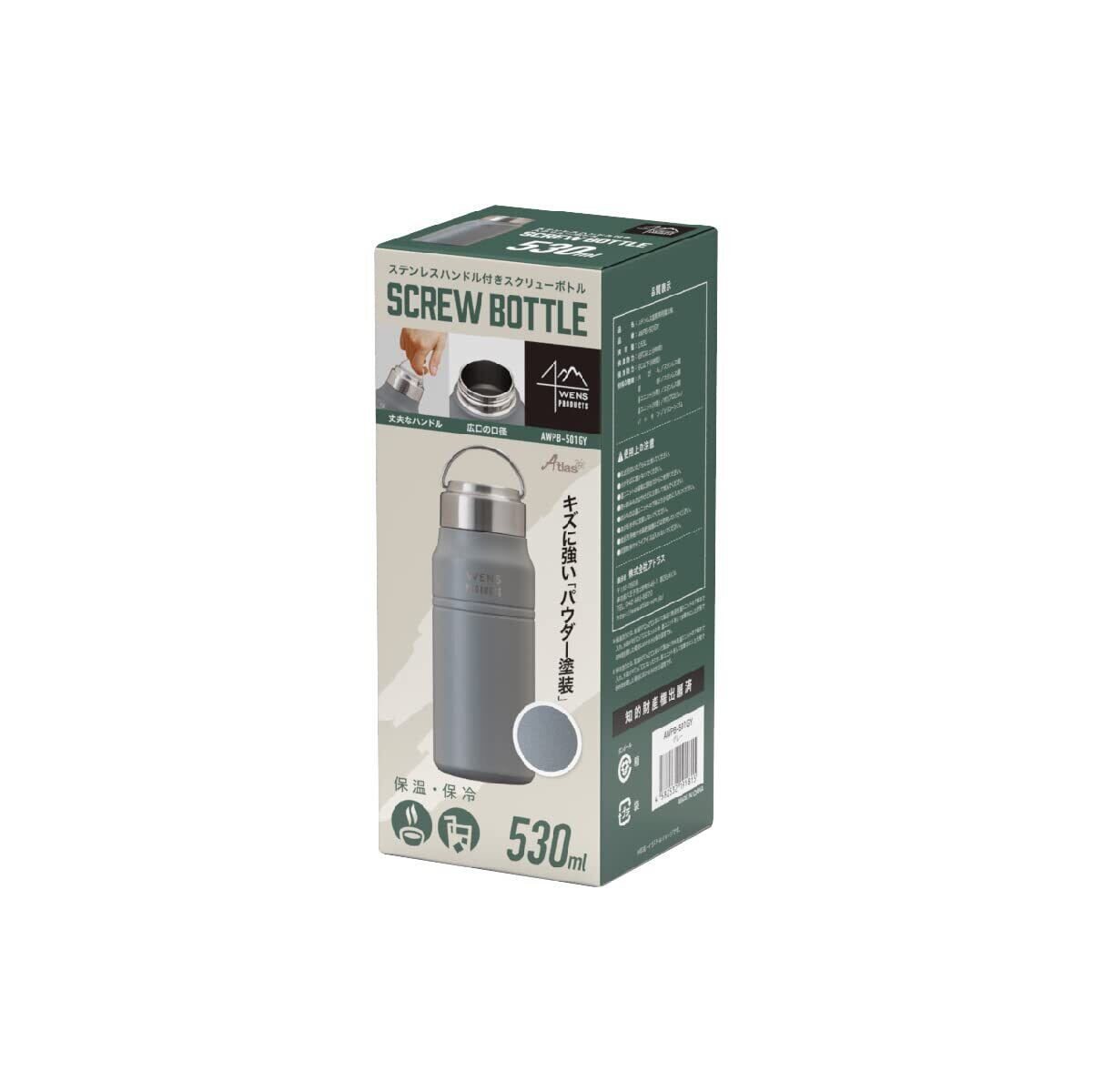 アトラス 水筒 500ml 保冷 保温 真空断熱 ステンレス マグボトル 軽量 直飲み 洗いやすい アウトドア WENS ウェンズ 530ml グレー 白湯 AWPB-501GY