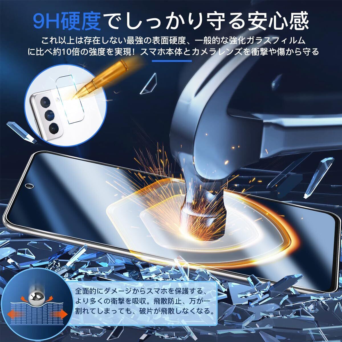 【超高品質·日本旭硝子素材採用】Galaxy S21 5G 強化ガラス 保護フィルムは日本旭硝子素材を採用します。高品質な素材で衝撃を緩和し画面の破損を最低限まで抑えます。ガラス420℃の焼戻炉で6時間加熱し、二次強化し、硬度が9H硬度に達しています。通常のPETフィルムより6倍の強度、その硬さは業界リードレベルの9Hに達し、強度が高いナノ弾性衝撃と防爆効果を備えて、鍵やカッターなどの鋭利な物を当てても損傷なく使用する事が可能。 特殊な飛散防止設計により、万一割れてしまった際にも飛散することなく、高い安全性を実現します。本体に圧倒的なフィット感も実現しています。すり傷や指紋からもスクリーンをしっかりと保護します。