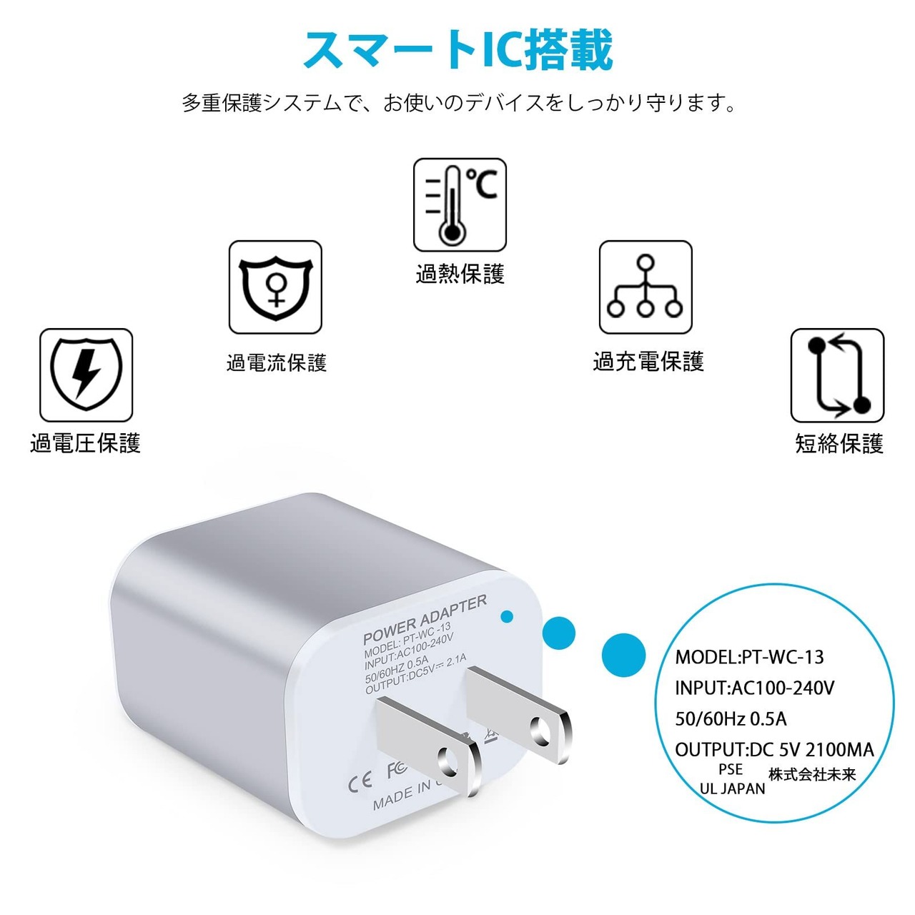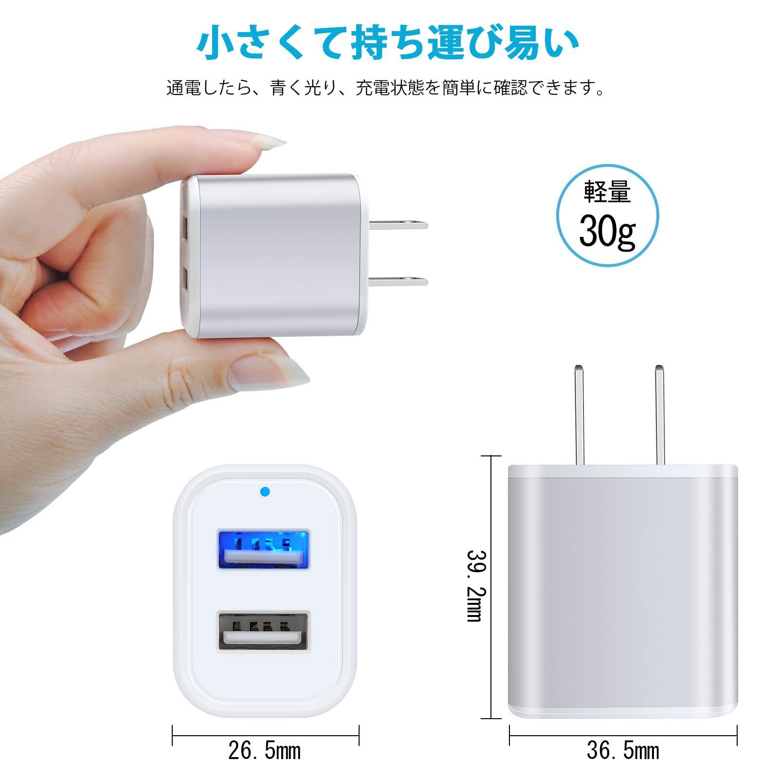 【ライト付き・便利な2ポート充電器】:入力電圧:AC100V-240V(海外・国内両用)、出力電圧:DC5V、出力電流:最大2.1A(2ポート合計)、重量:30g/個。USBポート内と上側にLEDライト付き、充電中は充電ランプが青色で点灯し、夜にも電源が入っているかどうか一目で確認できます。