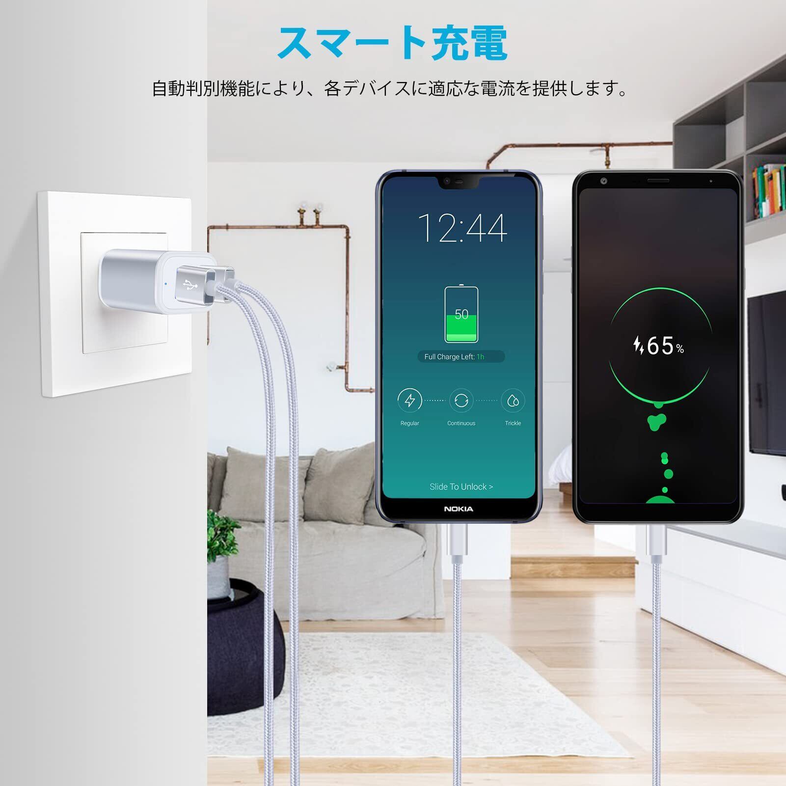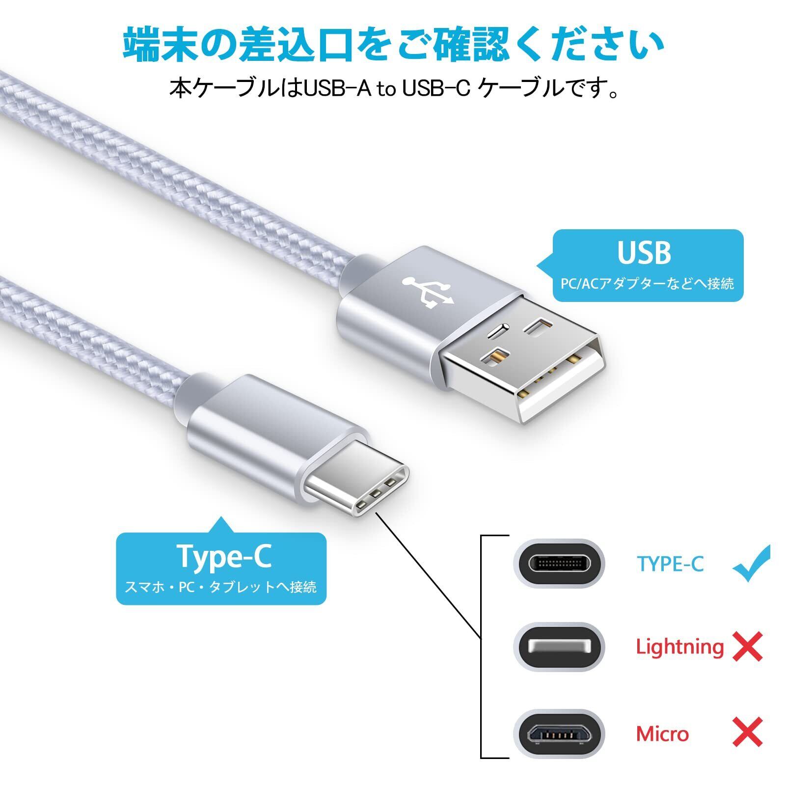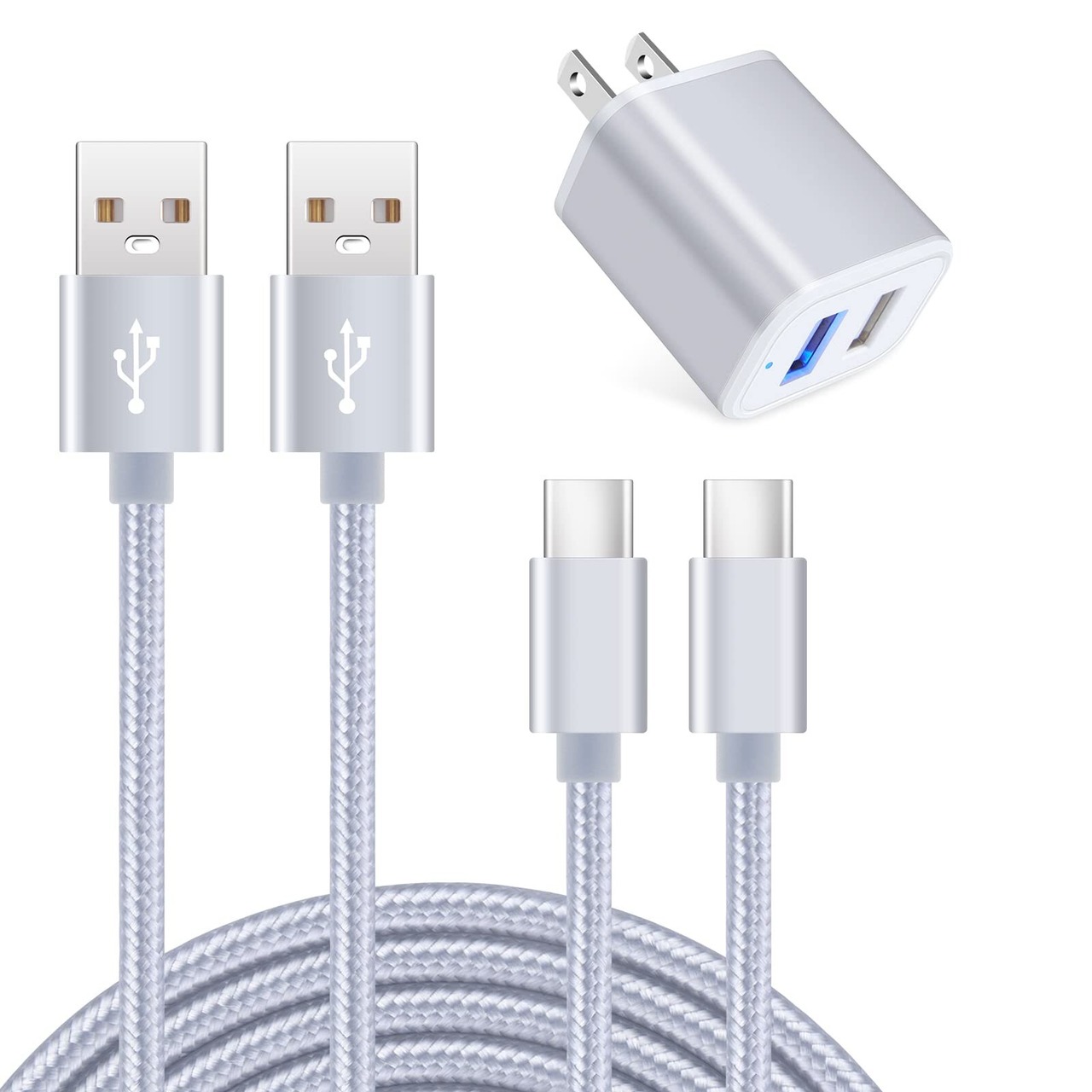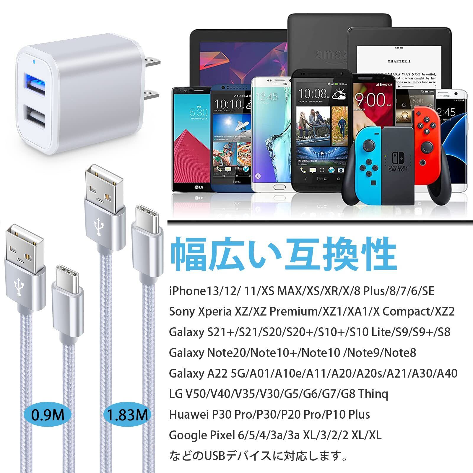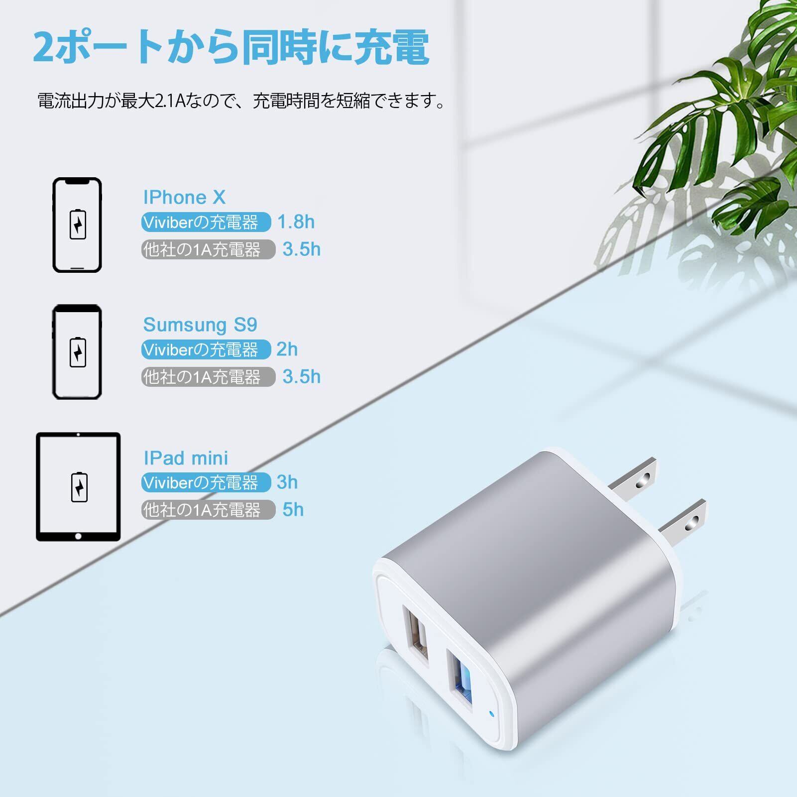 Viviber Andriod 充電器【Ledライト付き/Pse認証済】タイプC 急速充電ケーブル 2本付き【0.9M/1.8M】 USB2ポート ACアダプター Type-C USBケーブル 携帯充電器 コンセント アンドロイド スマホ充電器 軽量 コンパクト テレワーク 海外 シルバー iPhone 16/15対応