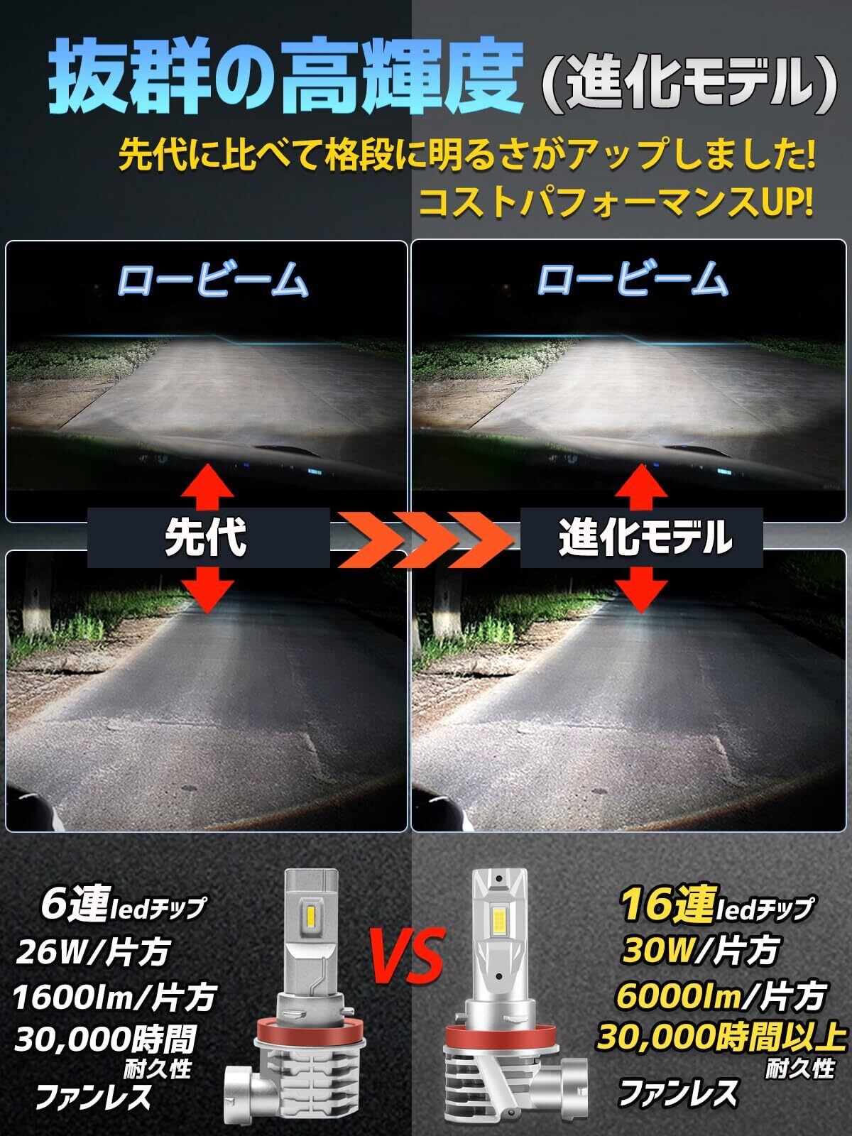 【爆光モデル・進化版】新型h11 led ヘッドライトは最先端16連チップ/片方を搭載しています。先代に比べて格段に明るさが向上しています。従来のledチップに比べて、安定性が大幅に向上し、発光効率が99%に達しました。チップ寿命が抜群で、光の衰えを抑えます。ノイズ対策のファンレス設計、爆光を実現したledヘッドライトです。お客様にはHID級の明るさをお楽しみいただきます!