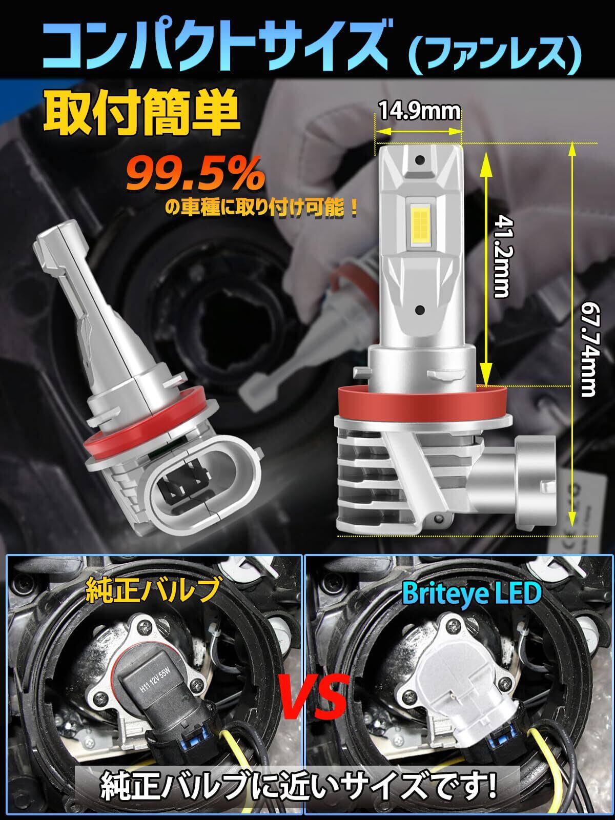 【爆光・進化モデル】Briteye H11 LEDヘッドライト爆光 新基準車検対応 H8 H9 H11兼用 LEDバルブ 6500K ホワイト 業界初の16連LEDチップ登場 高輝度LEDライト ファンレス ノイズ対策 互換性が高 12V車対応(ハイブリッド車・EV車対応) 2個入