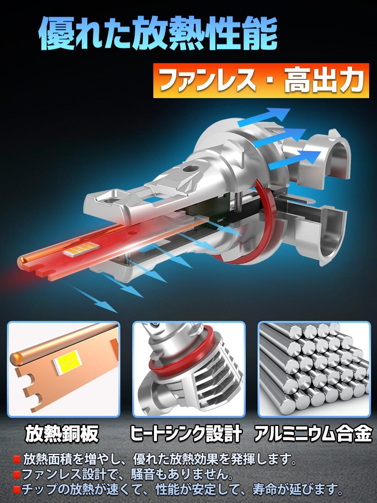 【安定した性能・優れた放熱】性能安定のための最適な選択を求める!H11ledヘッドライトには定電流保護回路が搭載されており、LEDの明るさを一定に保ち、安定して動作します。ファンレス型のヒートシンク設計で、騒音もありません。ライトユニット内で熱循環を行う為、冬季の使用でも安心です。透過度が非常に高く悪天候でも明るさを十分に発揮!放熱性、耐久性、省電力効果に優れた逸品です!