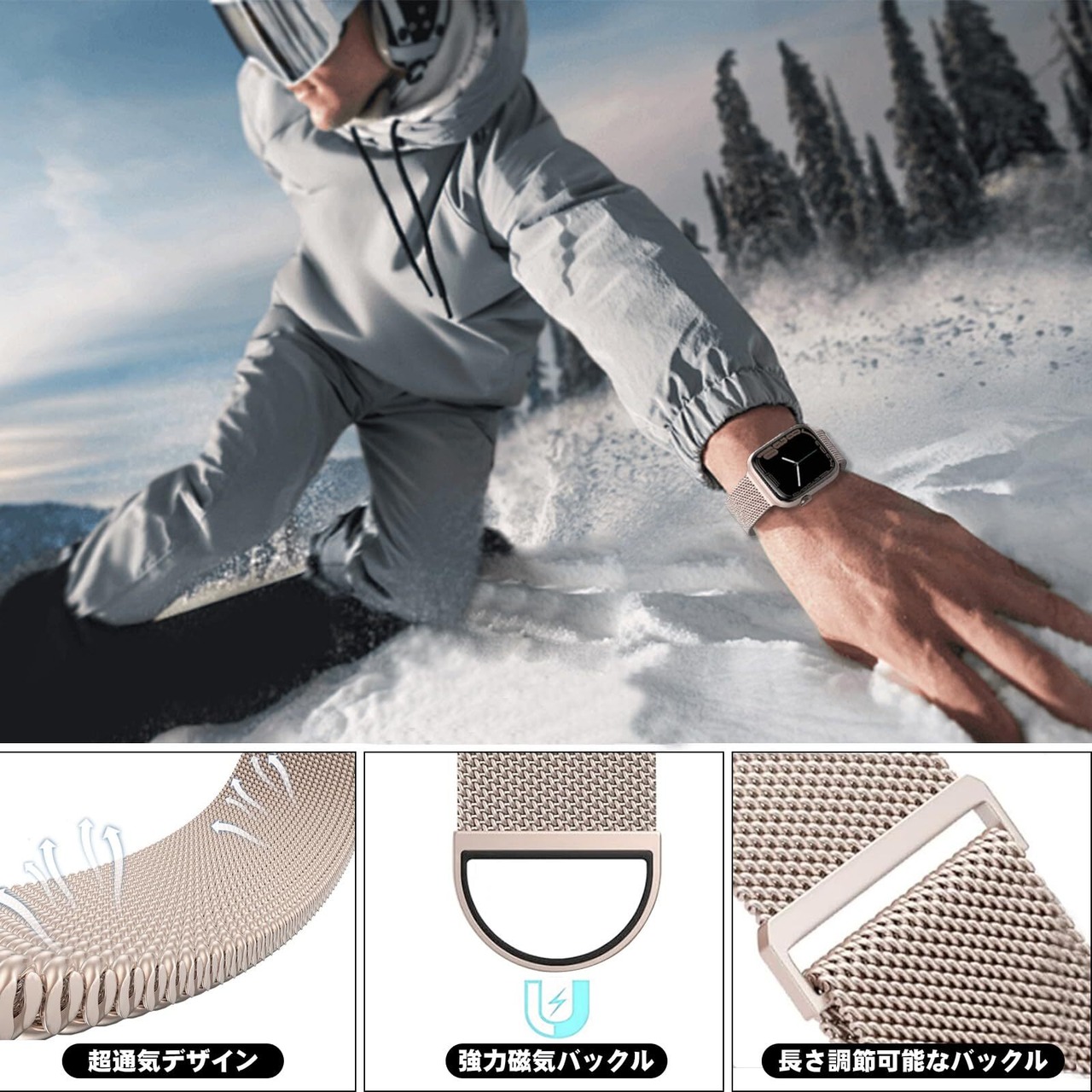 CAERMA コンパチブル アップルウォッチ バンド 38mm 40mm 41mm 42mm 44mm 45mm 46mm 49mm コンパチブル Apple Watch バンド ステンレス留め金製 男女兼用 長さ調節 強力な磁 通気 メッシュ ベルト コンパチブル Apple Watch Series 10/9/8/7/6/5/4/3/2/1/SE/Ultra 対応(49/46/45/44/42mm(Series 3), スターライト)