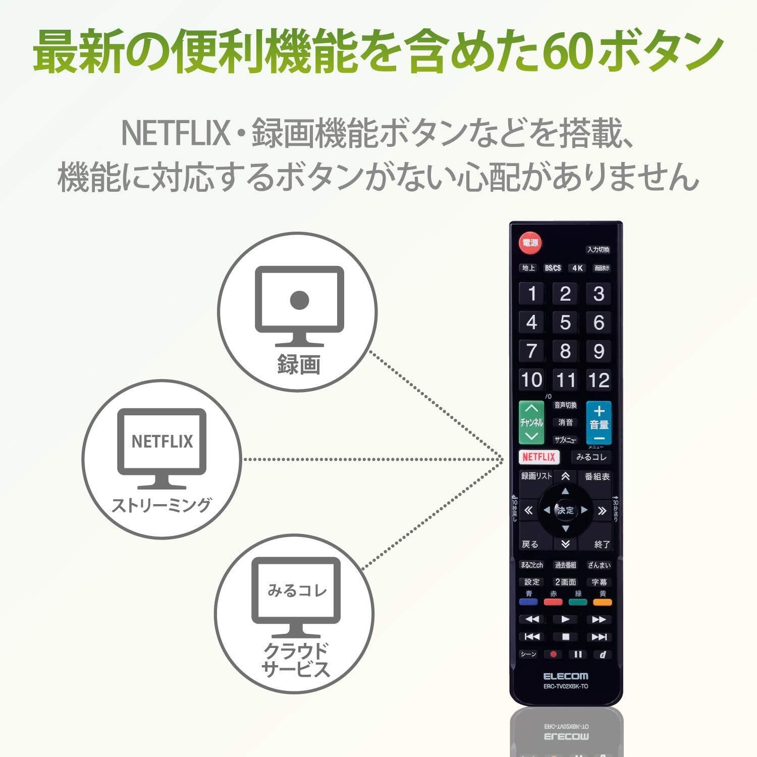 Netflixなど最新のリモコンボタンに対応し、充実したボタン数を搭載しています。